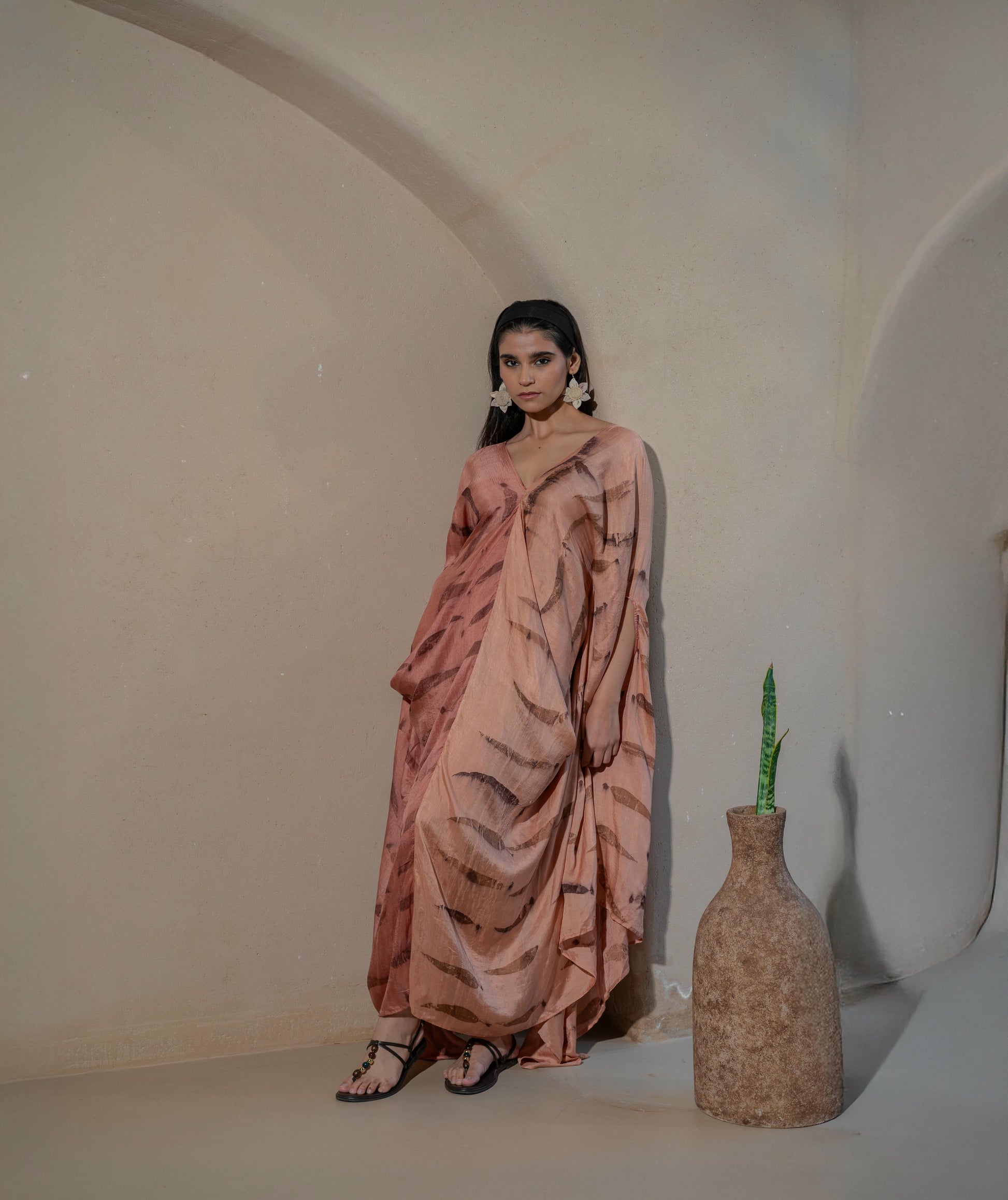 Featuring a maxi cowl drape dress made in handwoven mulberry silk , naturally dyed with eucalyptus