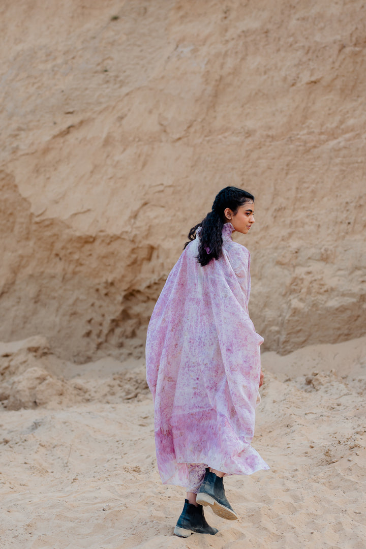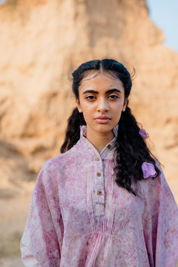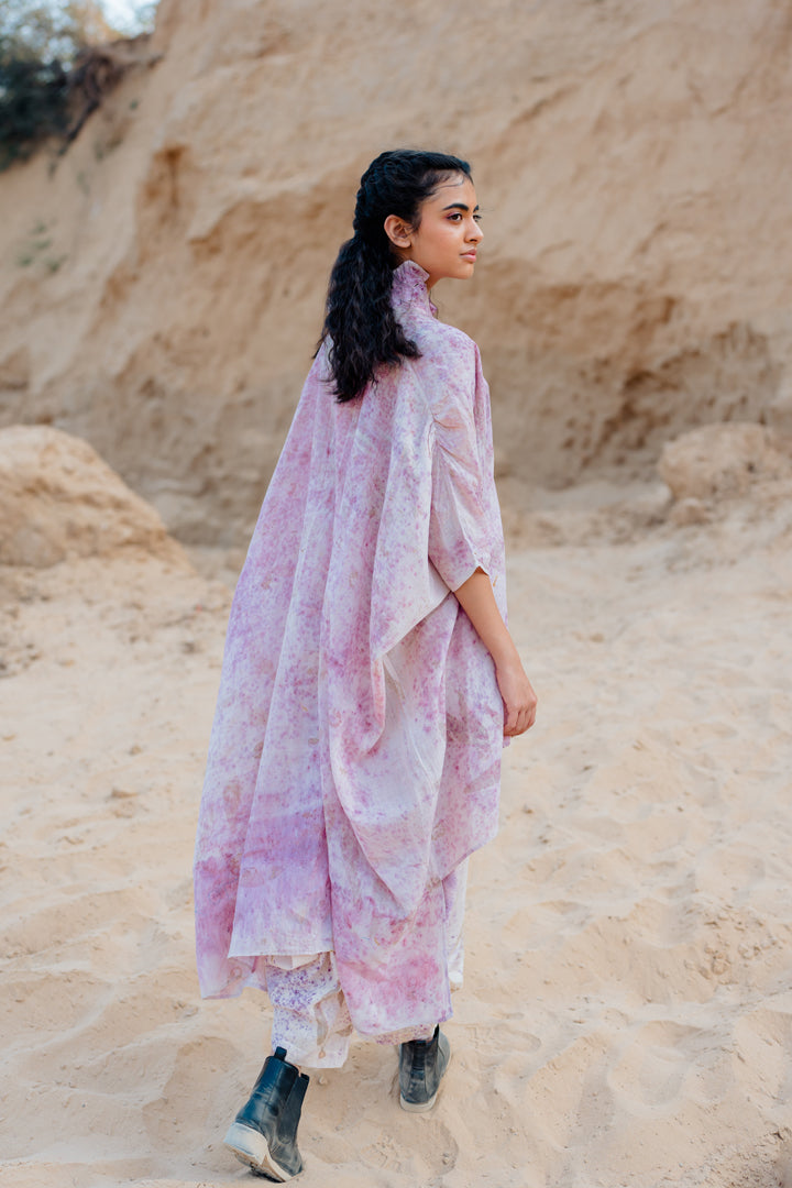 Asymmetrical hemline, draped Dress with front placket, Gathers at the waist, sleeves and neck. Mandarin collar. Bottom features drape pants, front belt, back elasticated waist, Ankle length with side pockets