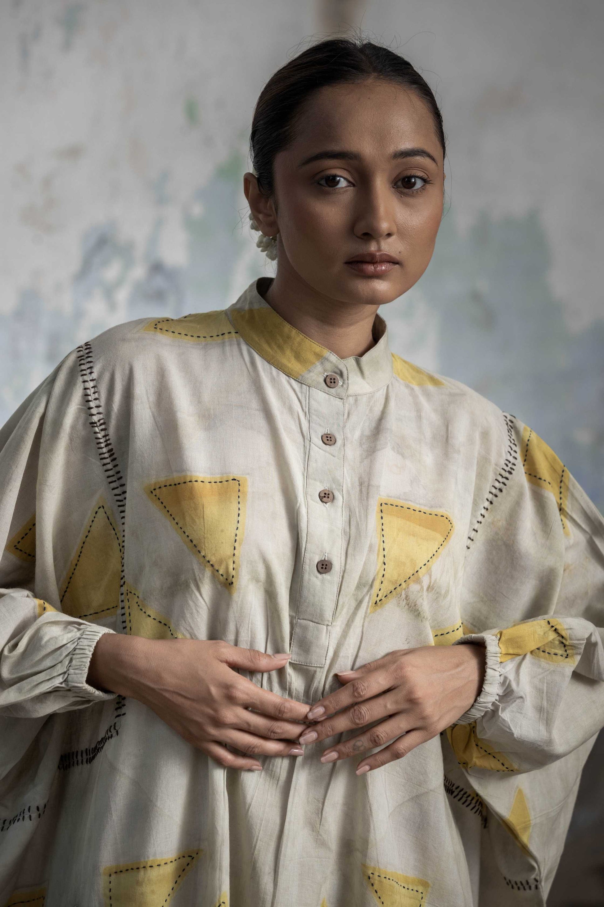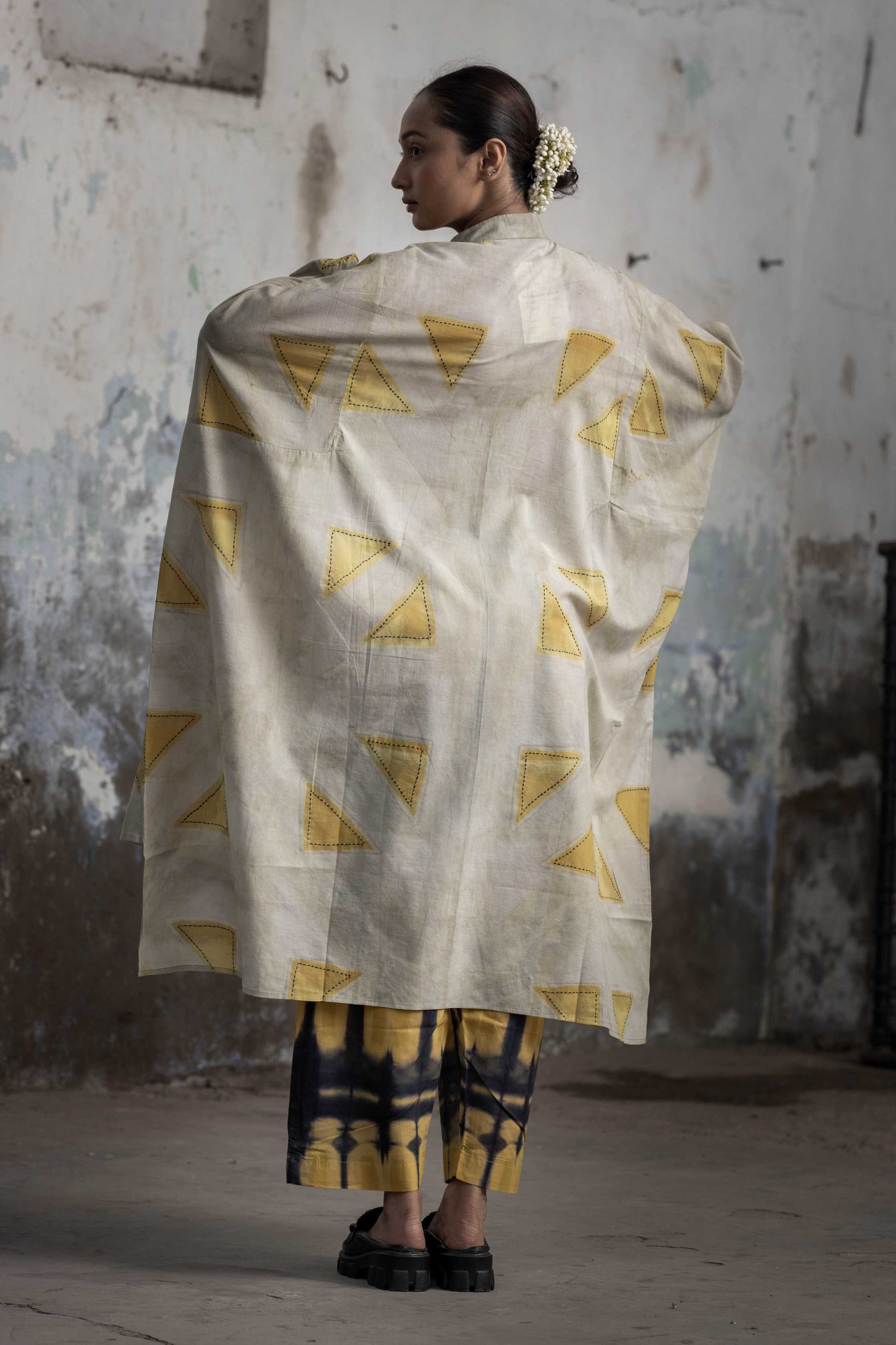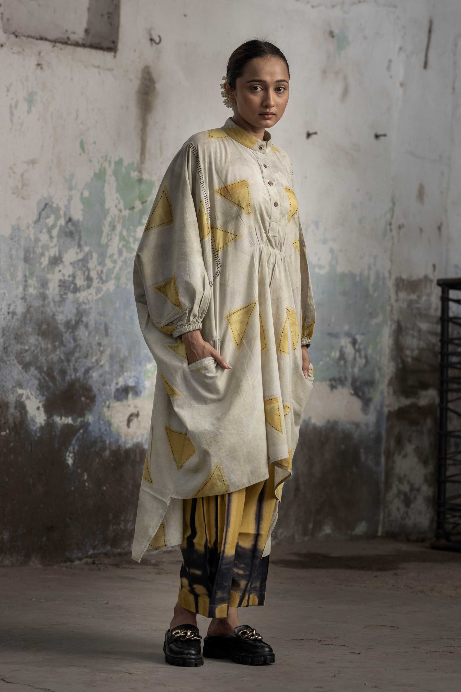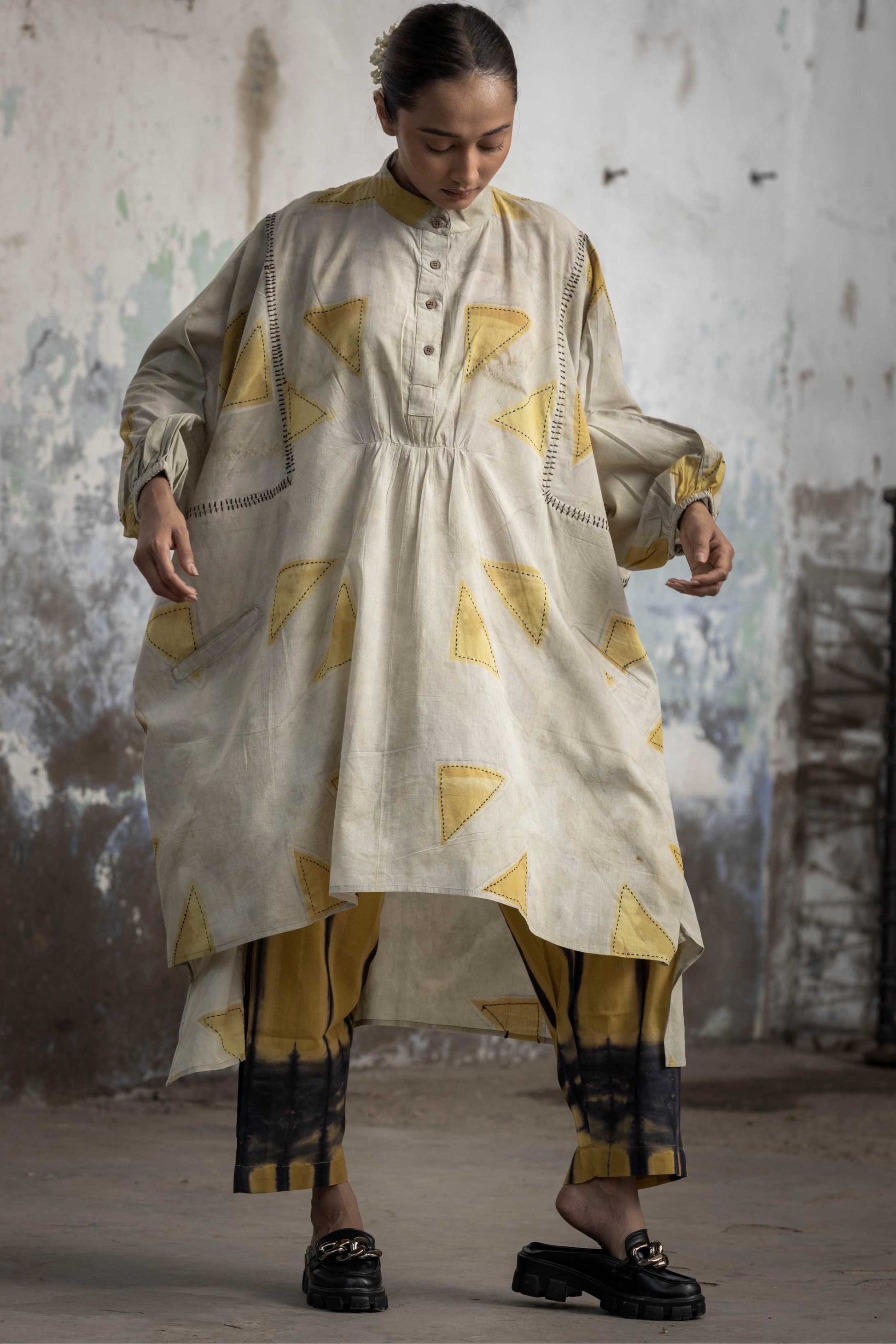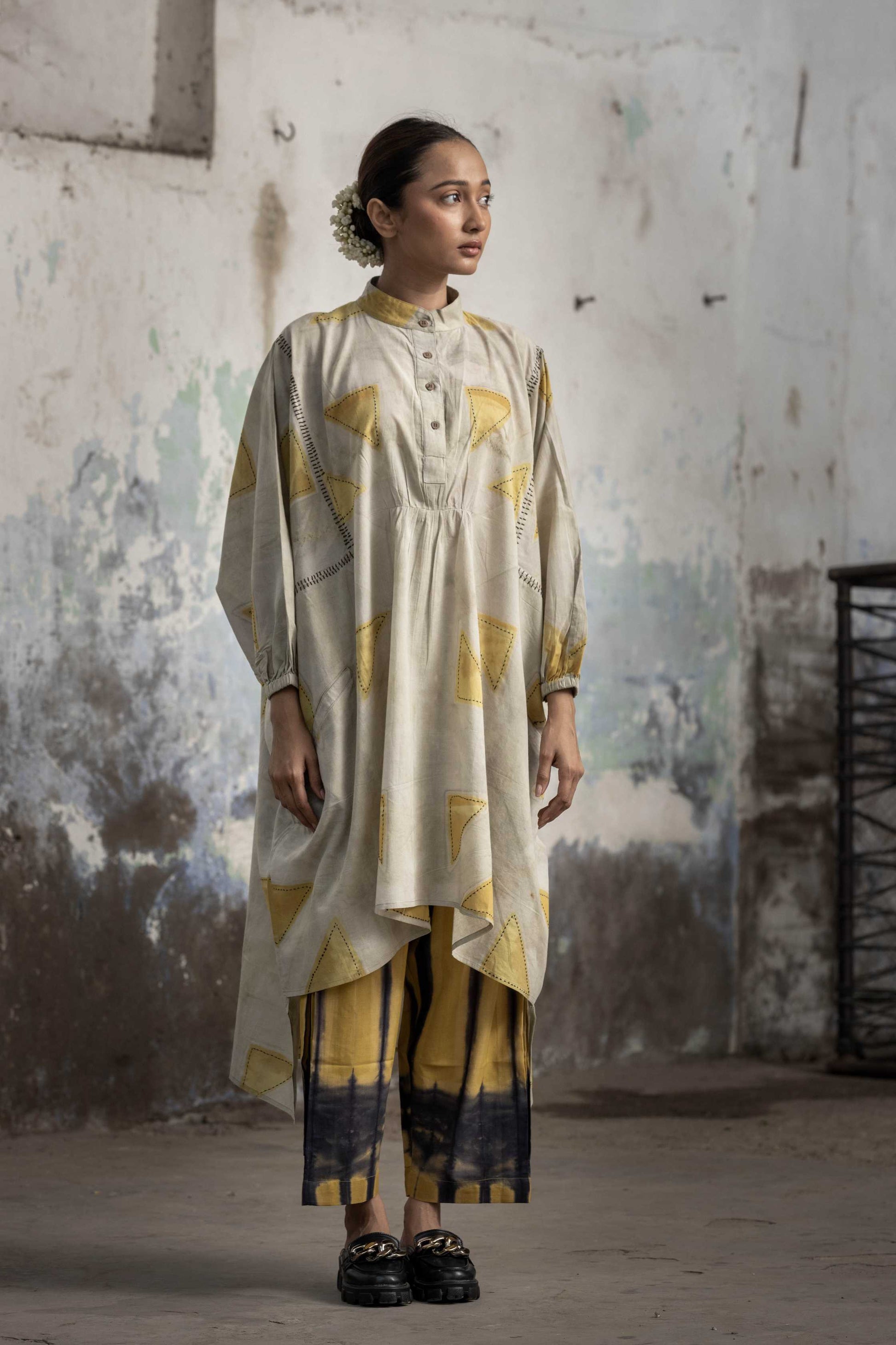 Our Tuscan sun set features, Kantha embroidery on triangular Shibori dyed Kurta, along with running stitch on enhanced sleeves seam line. This is paired with stripped clamp dye ankle length pants.