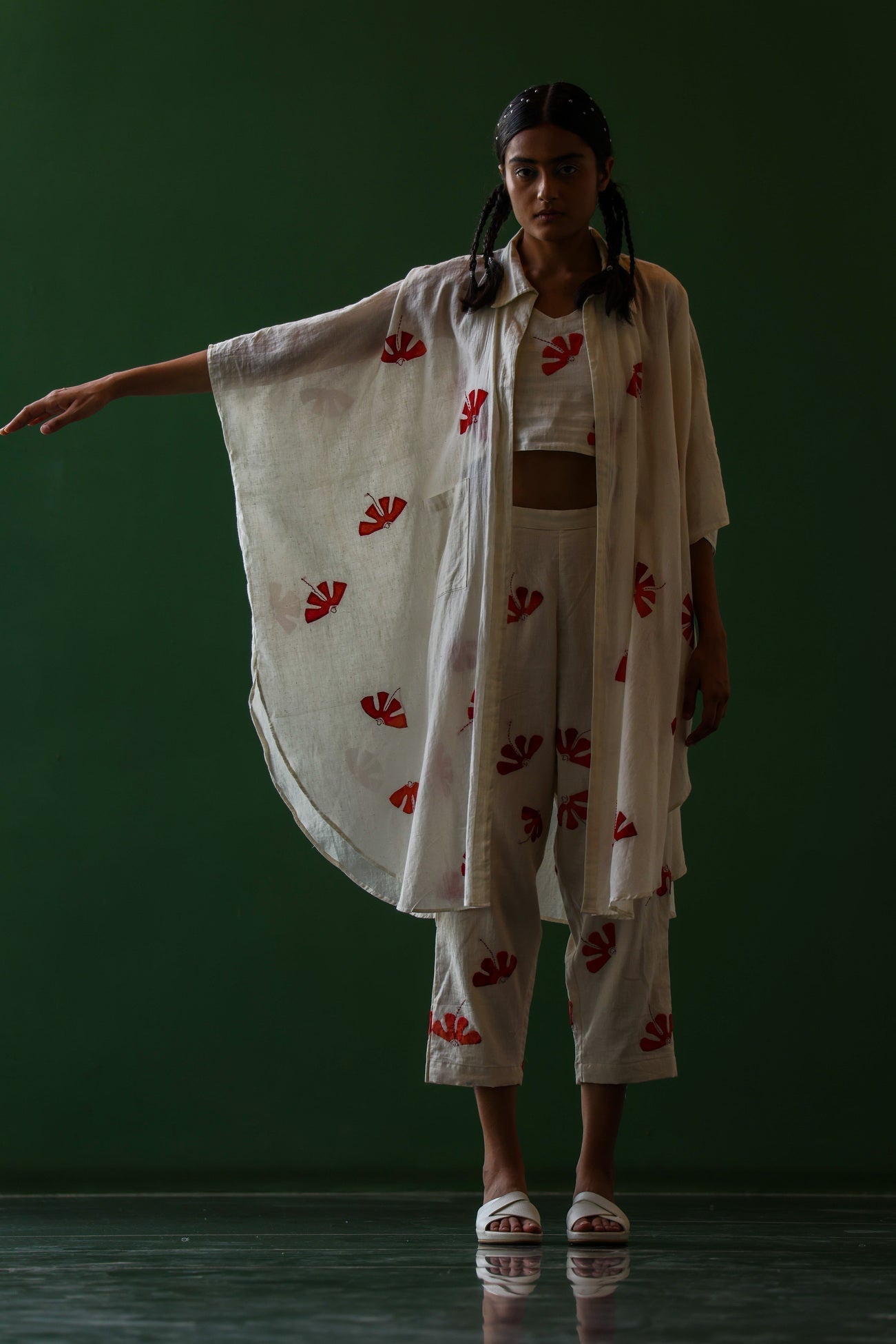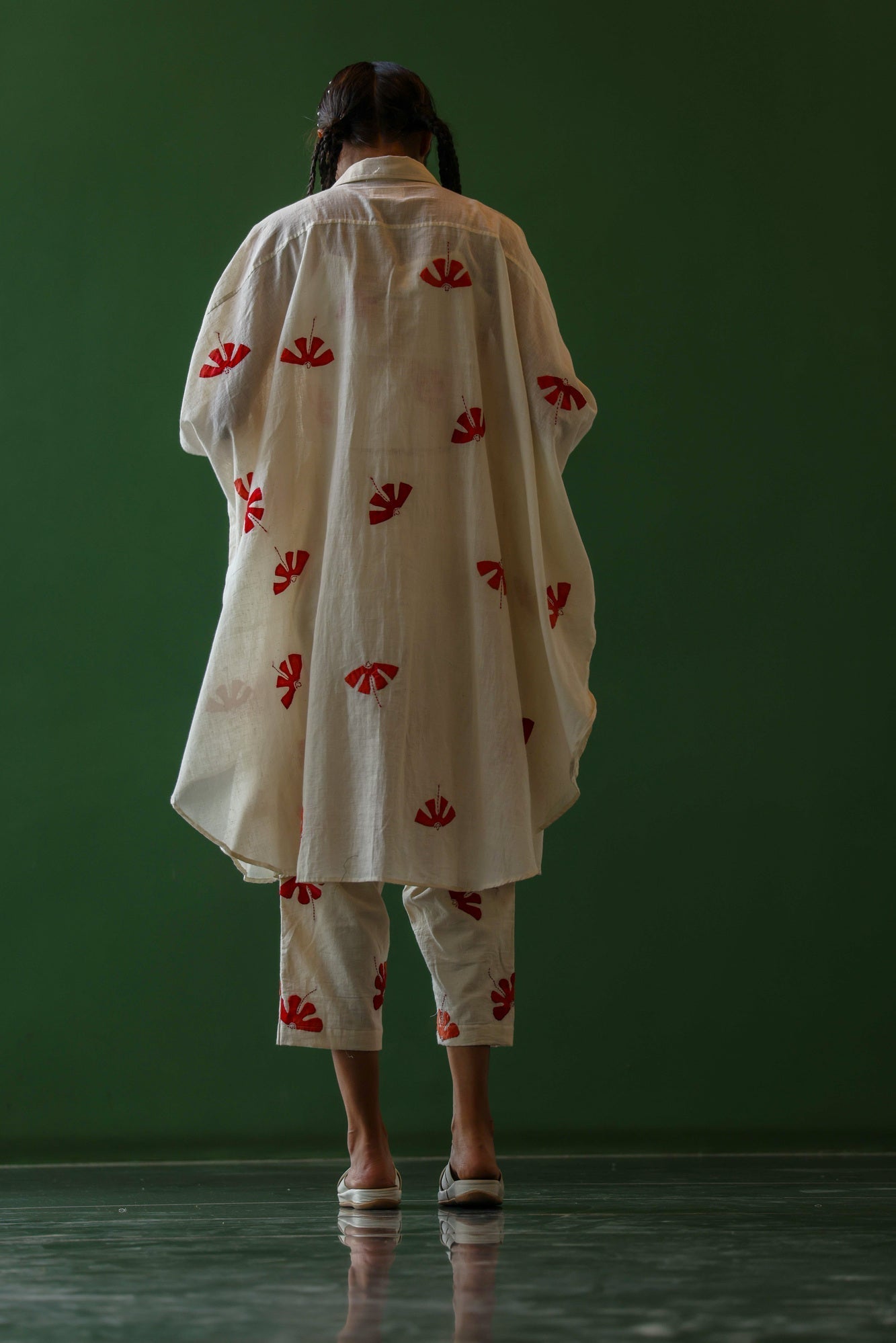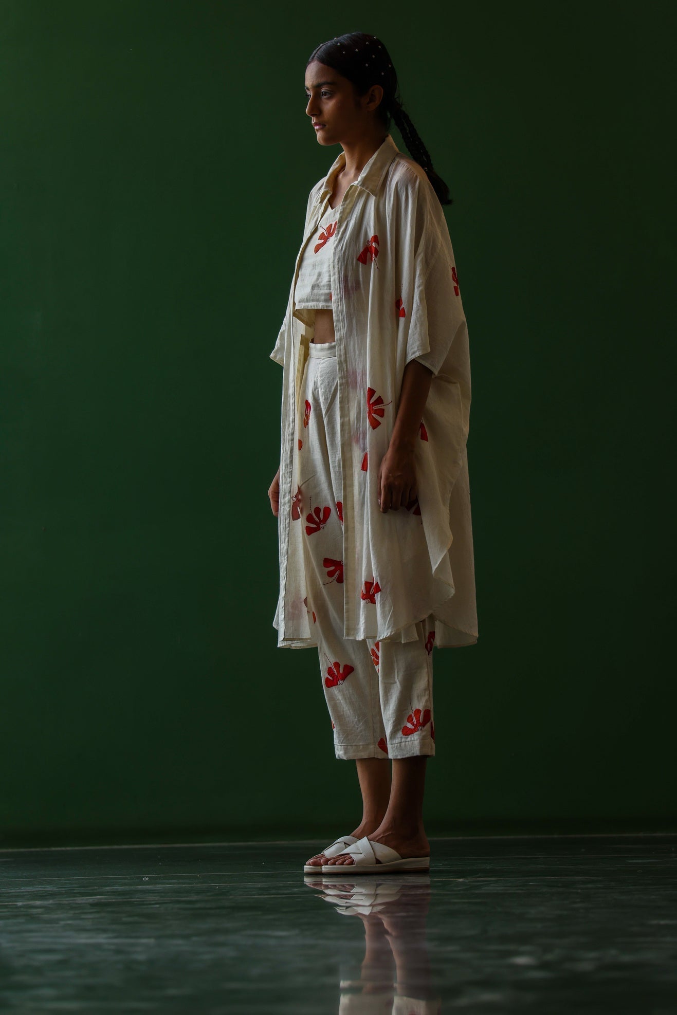 A relaxed open front overlay with flower applique details. Features a shirt collar, a patch pocket and side slits.