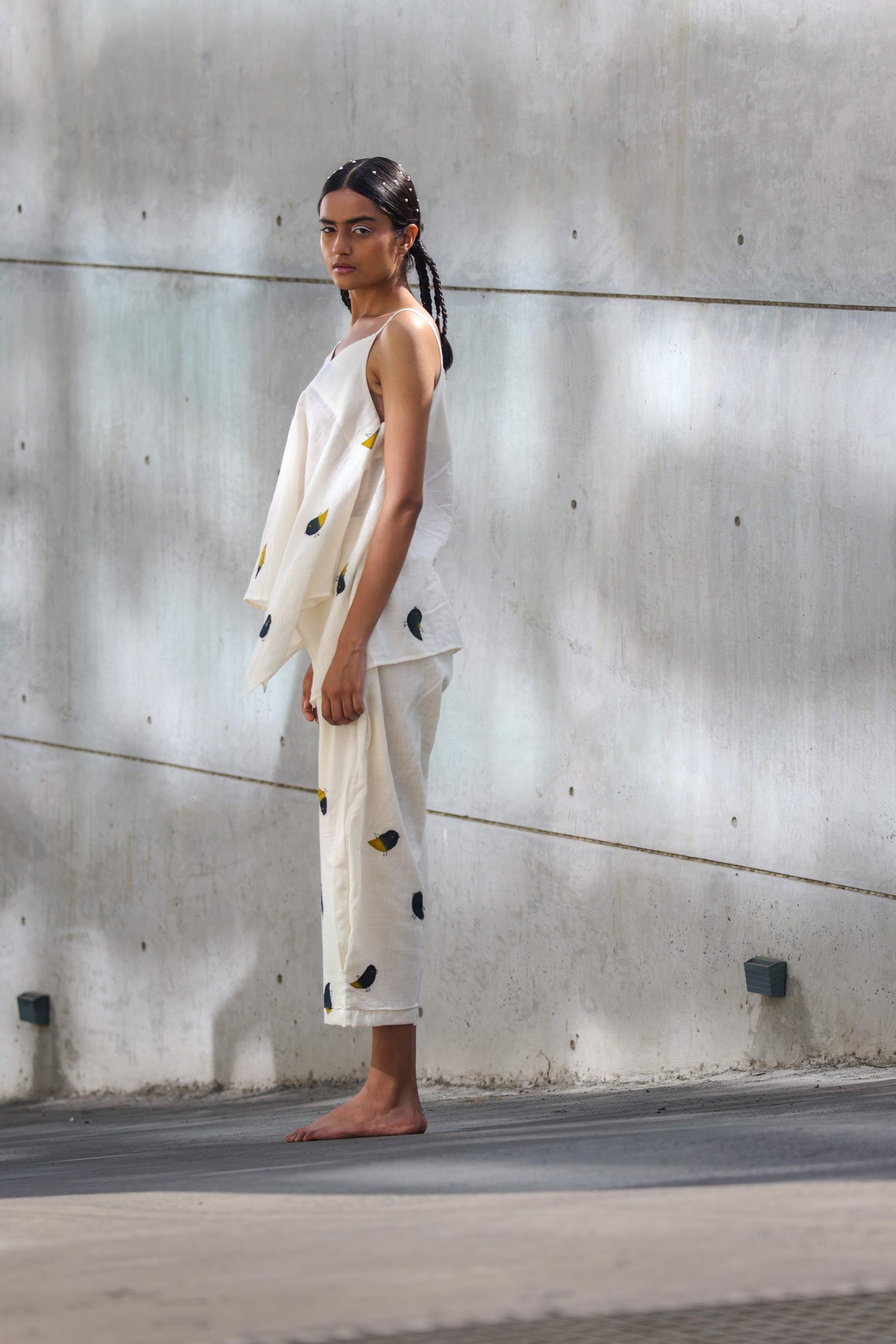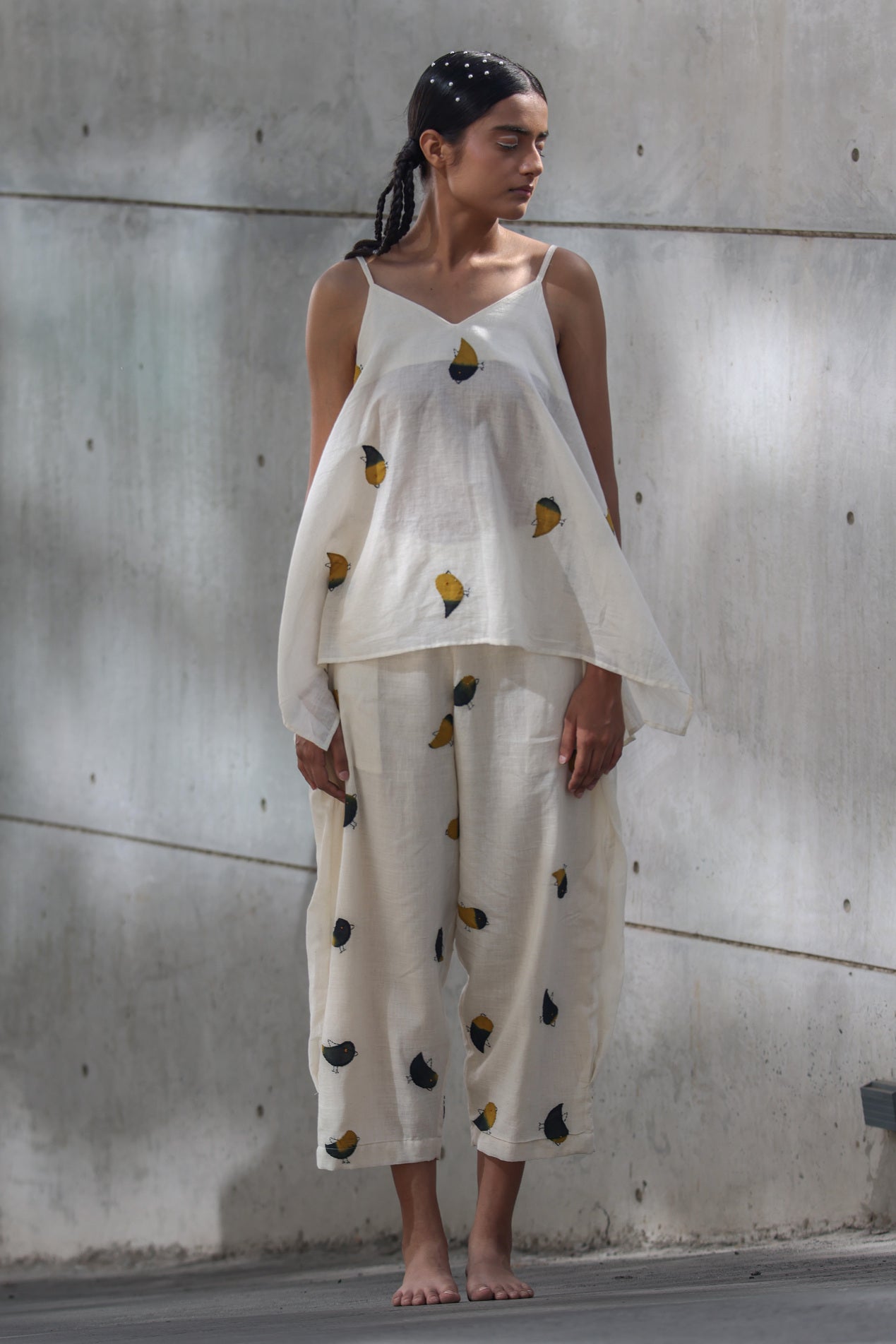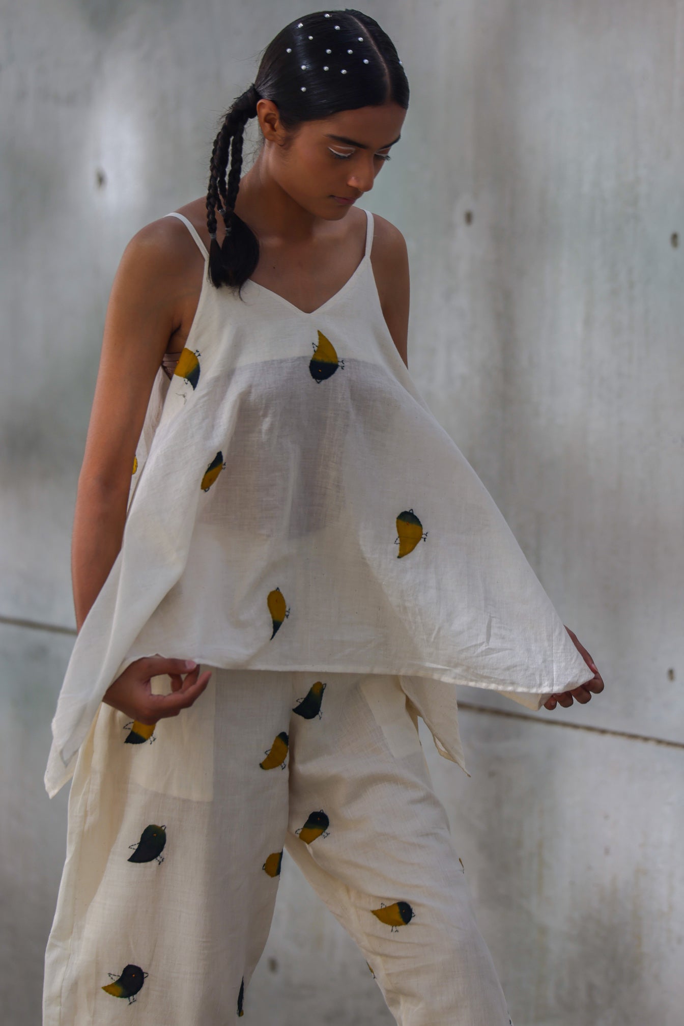 A two-piece set pairing the Canary Bird Top and Pants, both with bird applique details. The A-line top features an asymmetric hem, noodle straps and a V-neck. The balloon pants feature side pockets and an elasticated back.