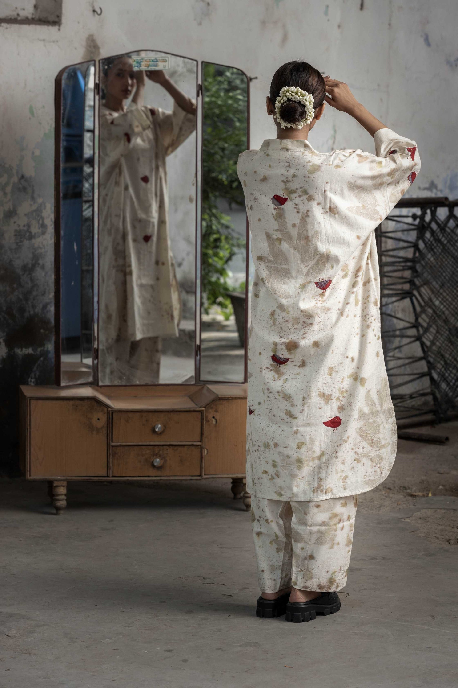 Our Bulbul set features, Knee length kurta with direct sleeves and eco-dyed pants.