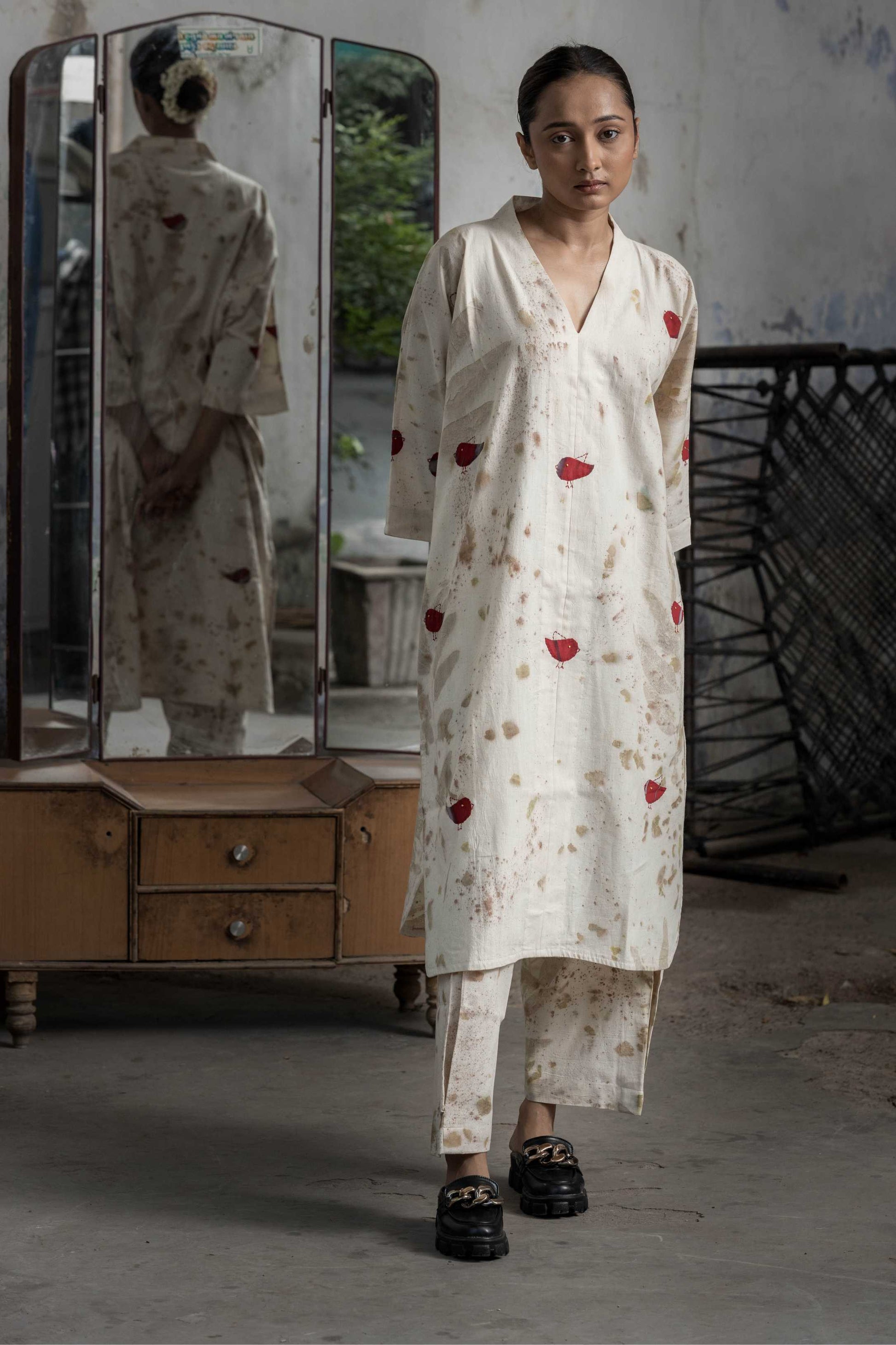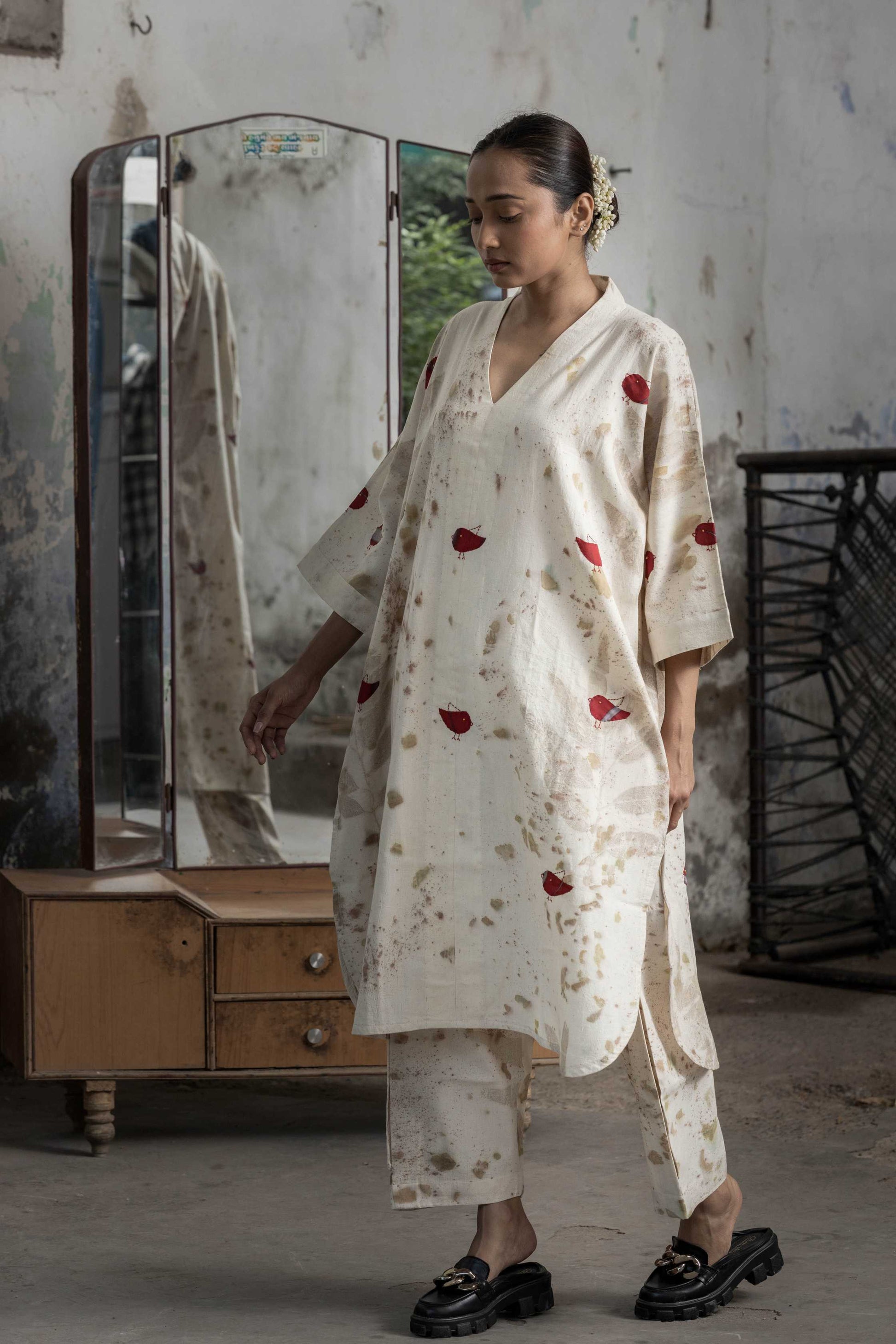 Bulbul set is fully eco dyed using natural elements. Kurta has all over appliqué motifs embroidered using leftover fabric from our earlier Collections.