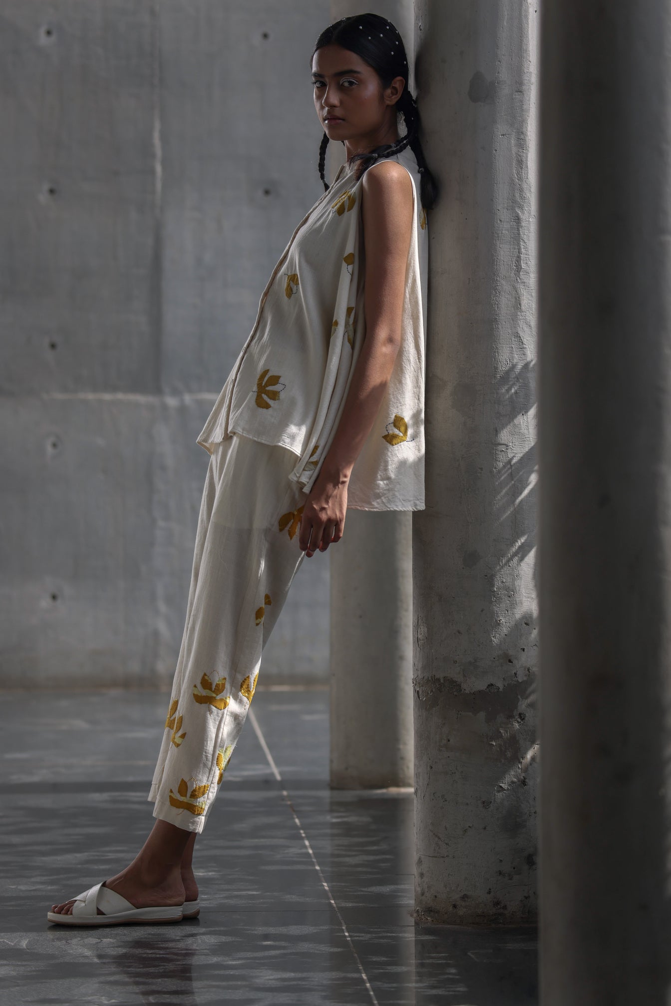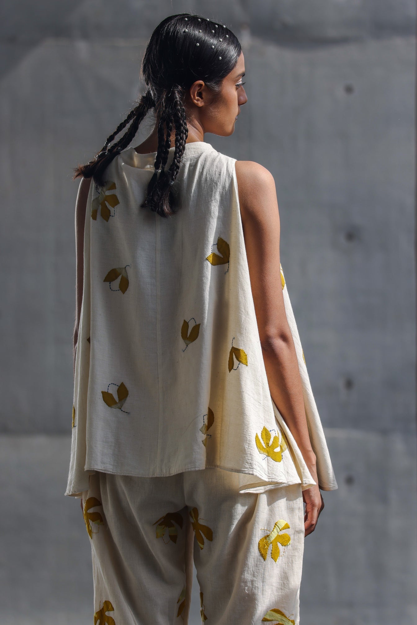 A swingy A-line tent top with flower applique details. Features a round neck and front button placket.