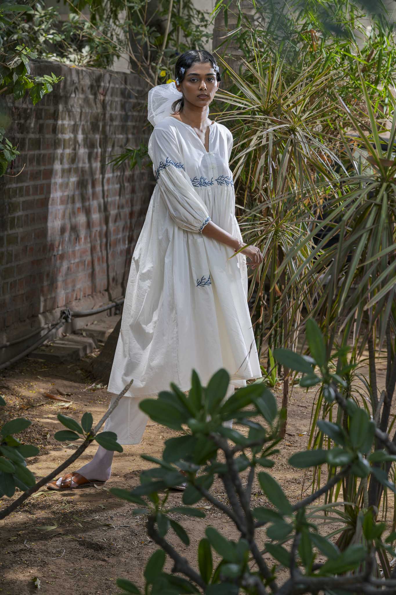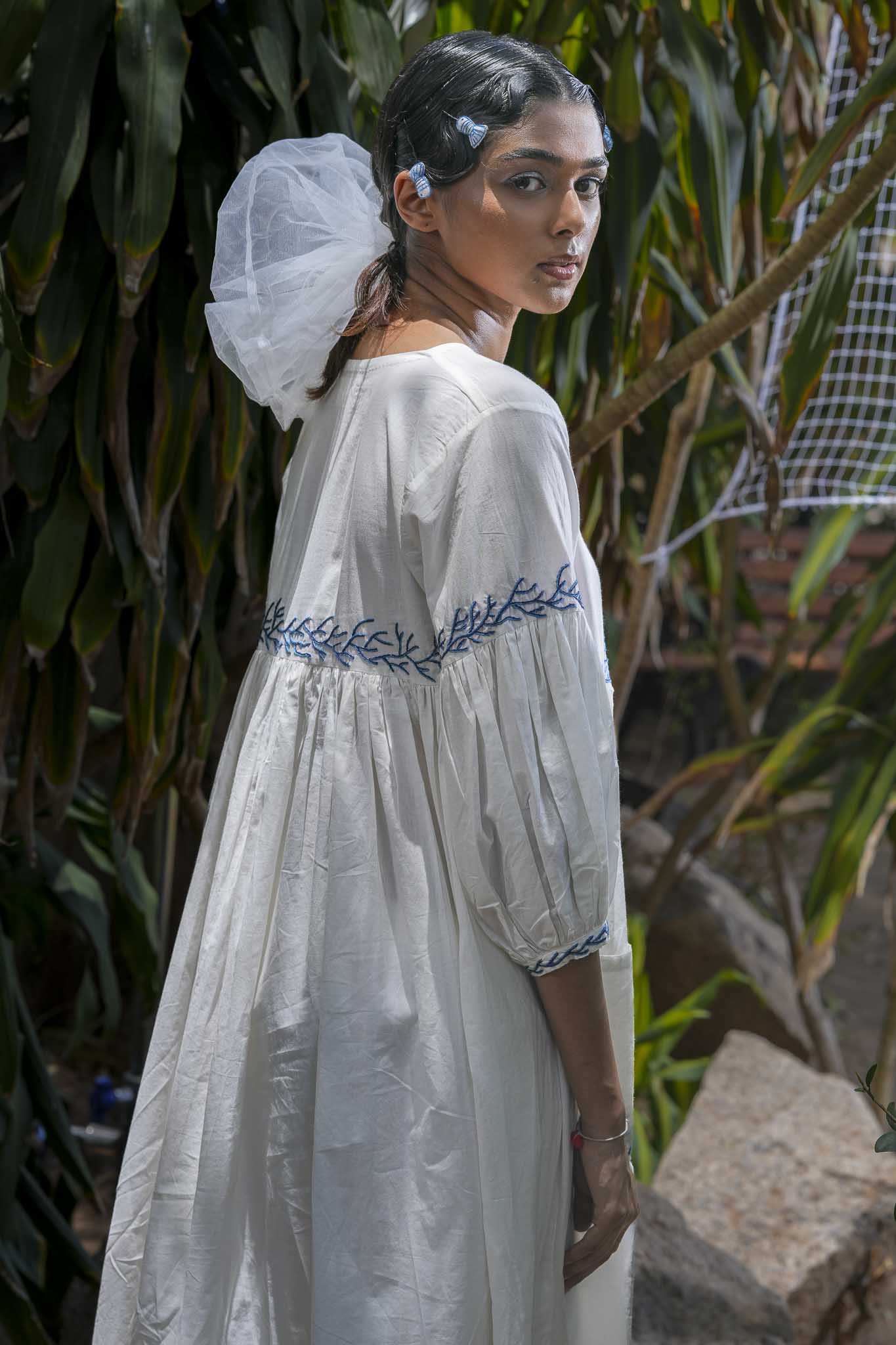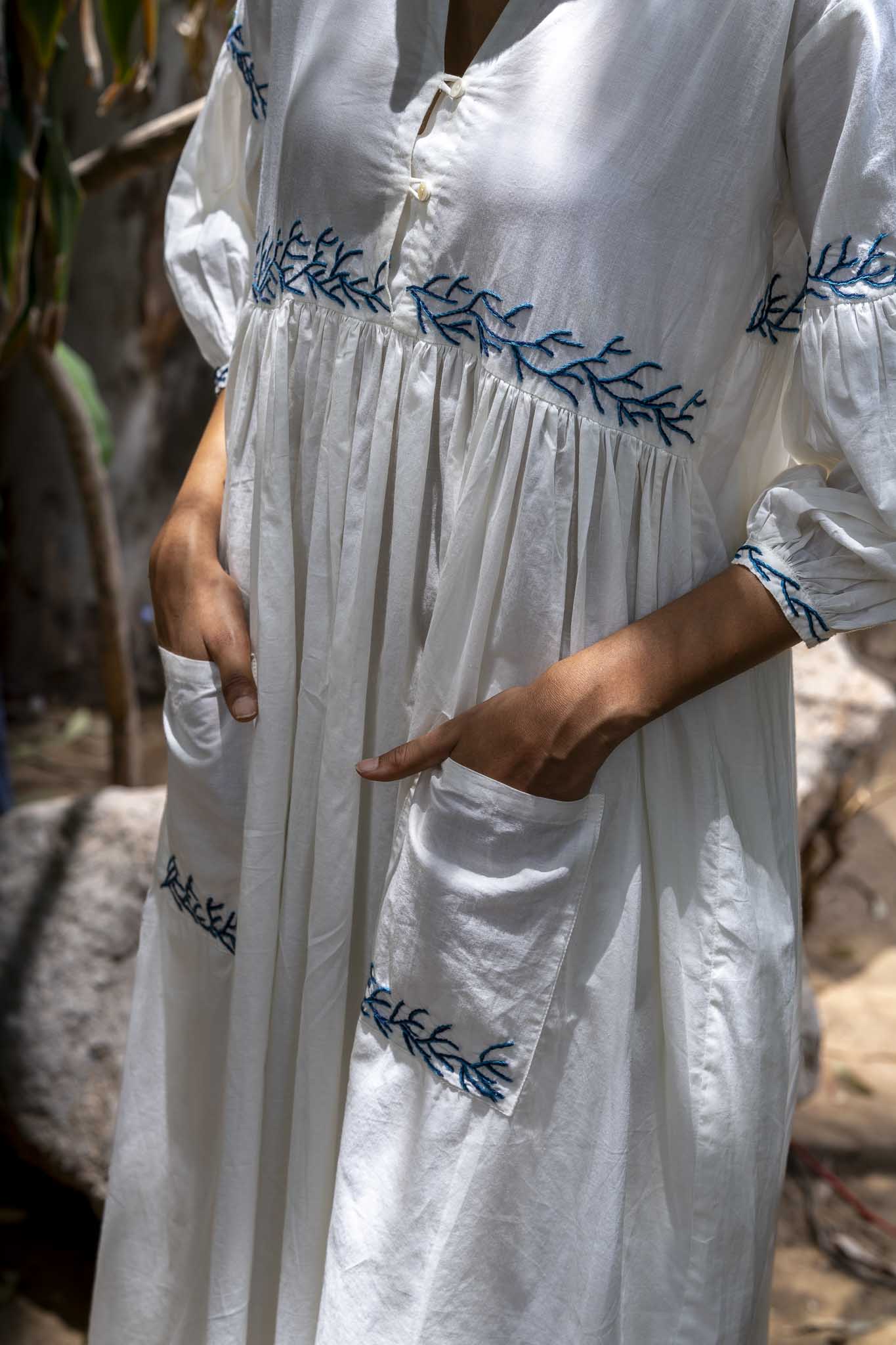 This gathered A-line dress features two front patch pockets (7.5" long and 6" wide). The sleeves are a standout element—half set-in sleeves and half balloon sleeves. The gathered body of the dress adds volume and ease. Coral embroidery is placed in a way to highlight the seams and pockets. It is done using stem stitch.