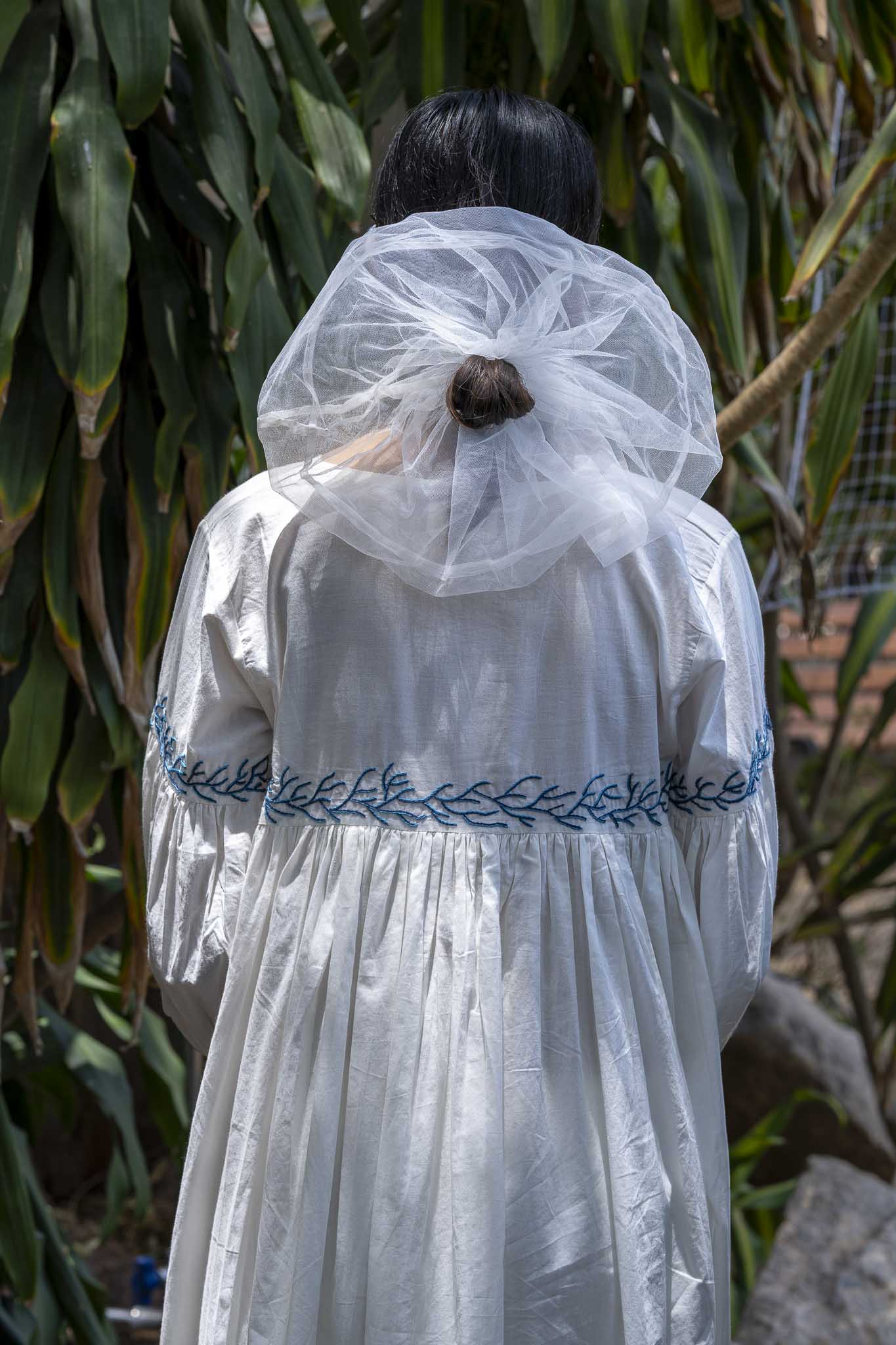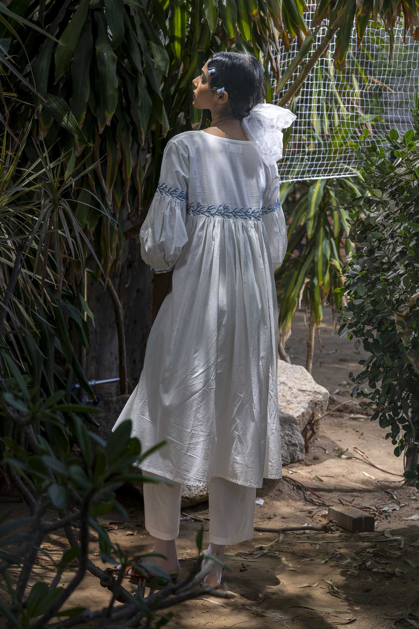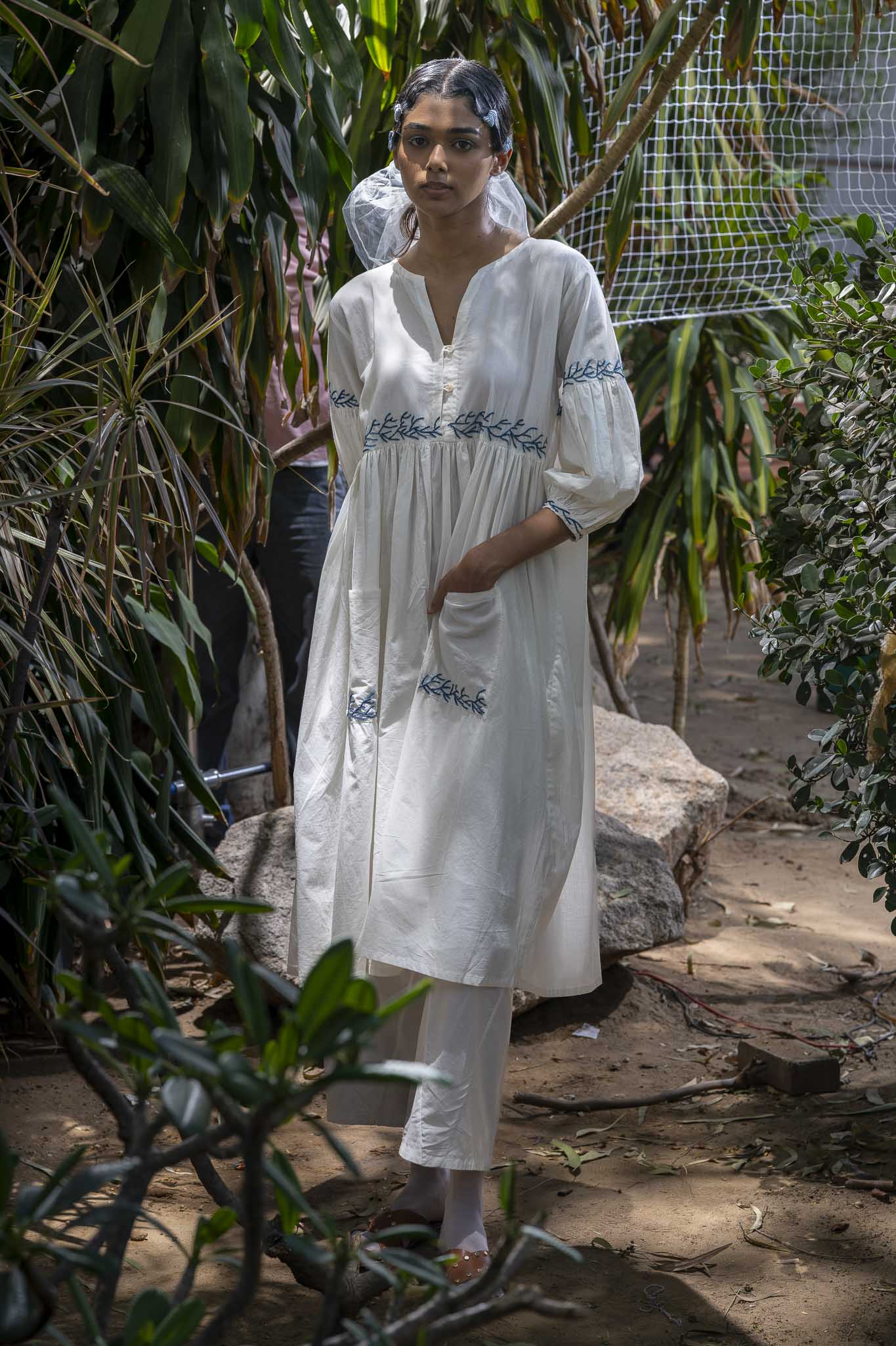 This gathered A-line dress features two front patch pockets (7.5" long and 6" wide). The sleeves are a standout element—half set-in sleeves and half balloon sleeves. The gathered body of the dress adds volume and ease. Coral embroidery is placed in a way to highlight the seams and pockets. It is done using stem stitch.