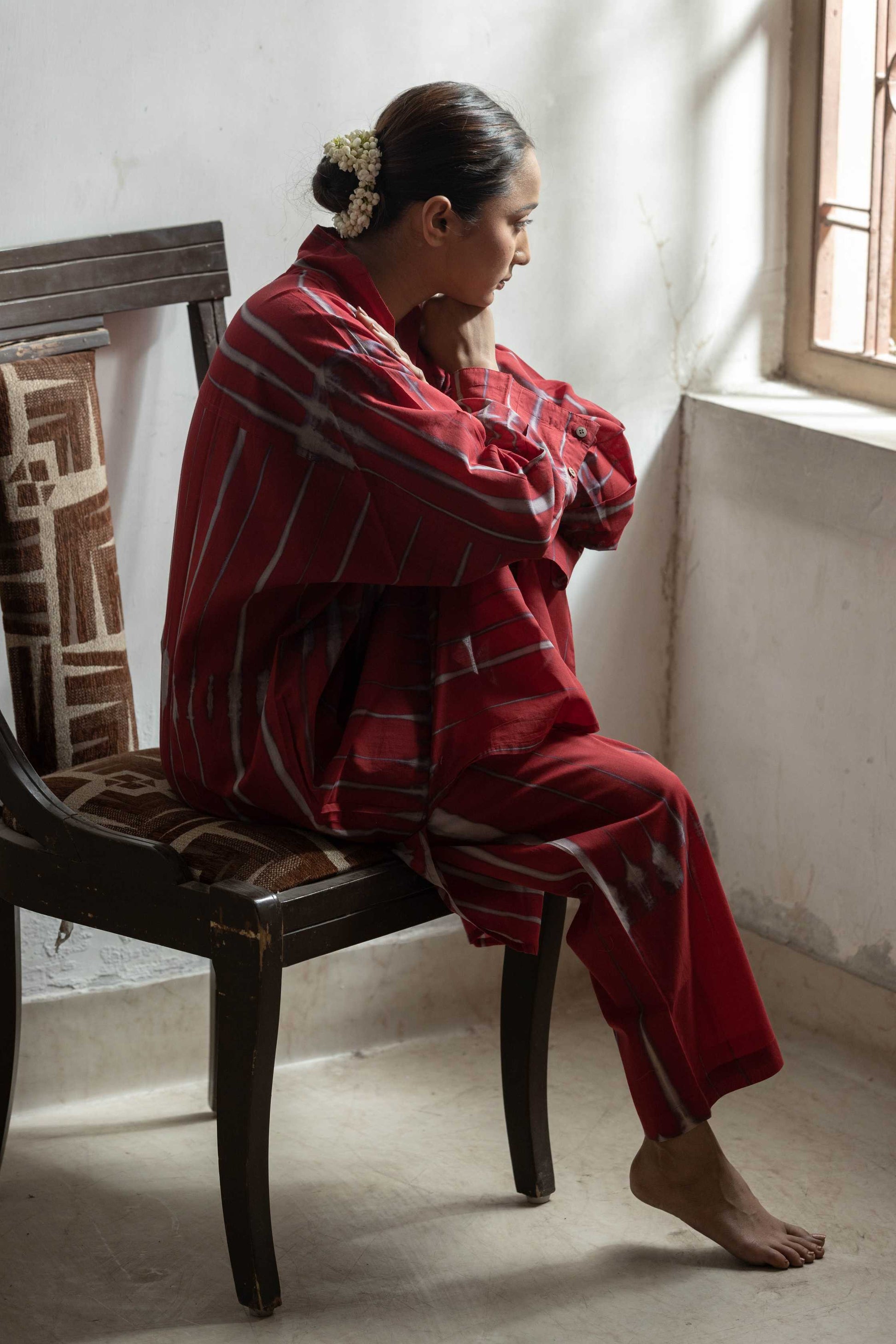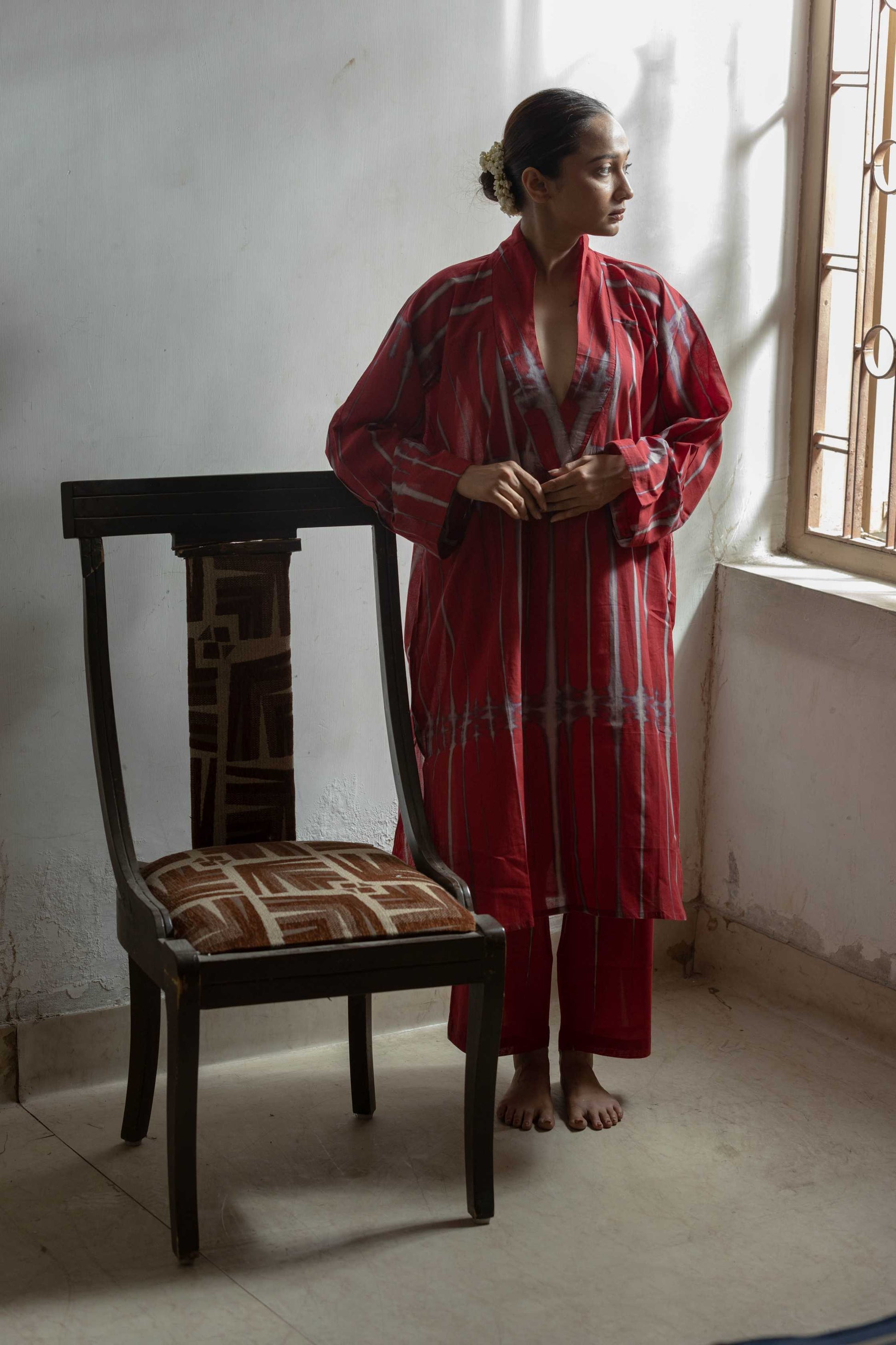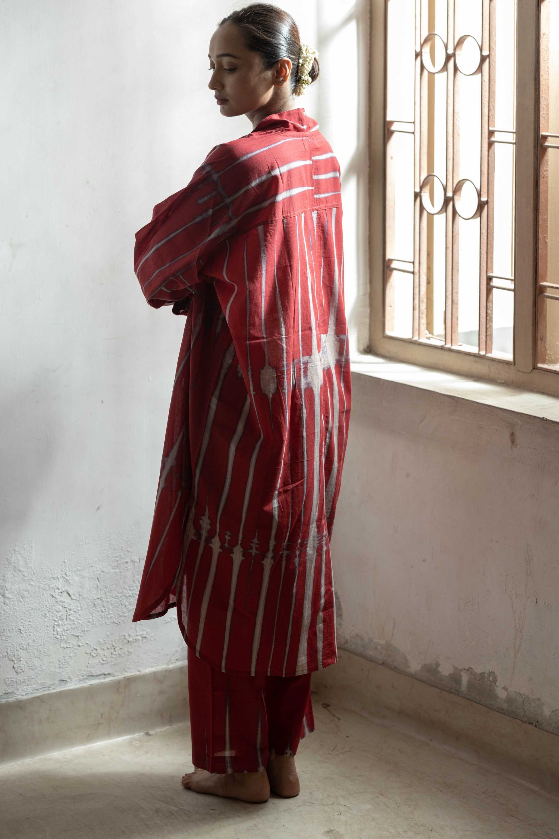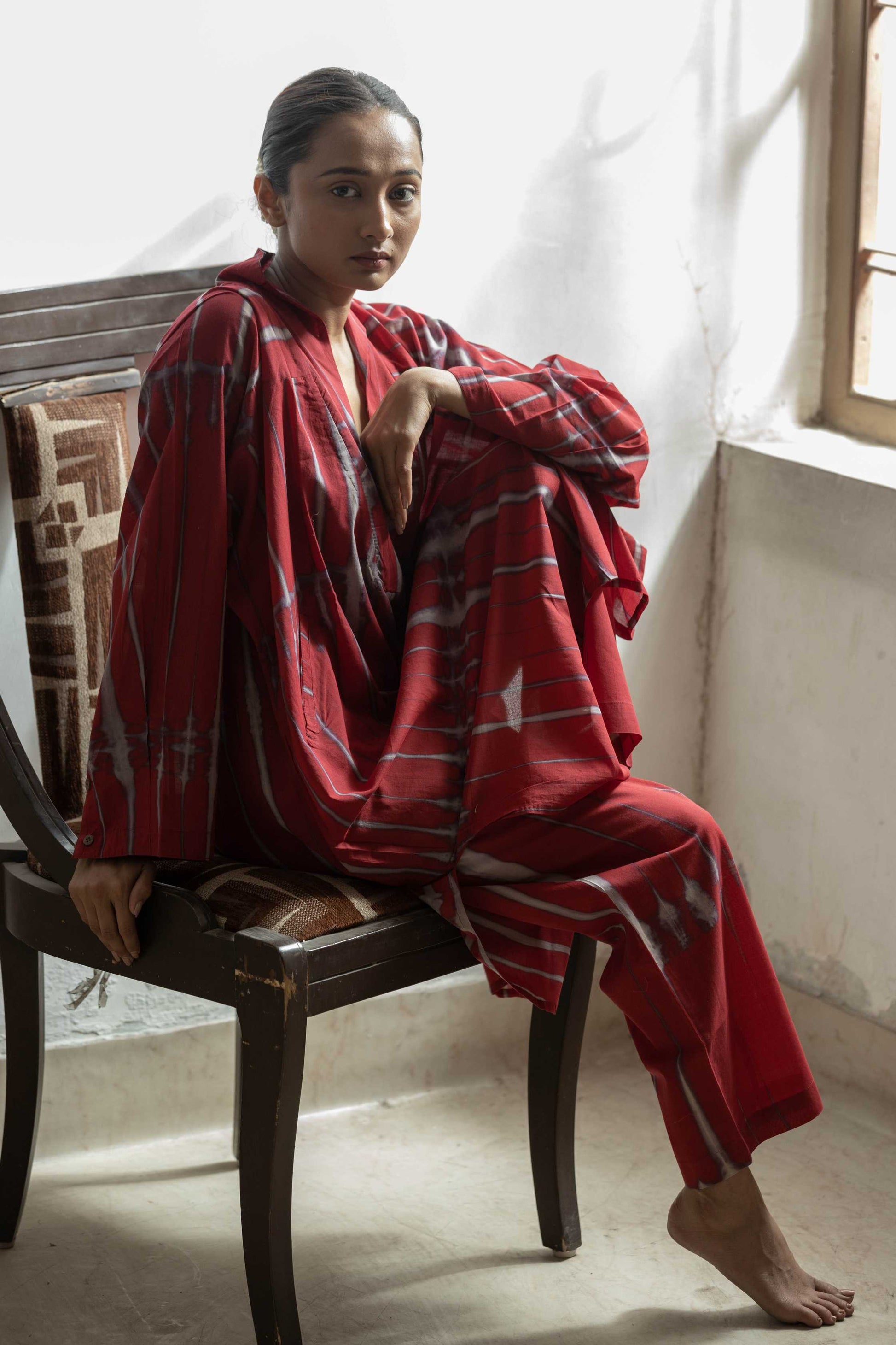 Our Cranberry kaftan set features, stripped Shibori dyed Tunic and pants. Along with V-collared neckline and 2 wooden button detailing at the cuffs.