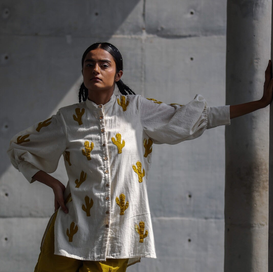 An oversized shirt with balloon sleeves and cactus applique details. Features a mandarin collar, front button placket and side slits.