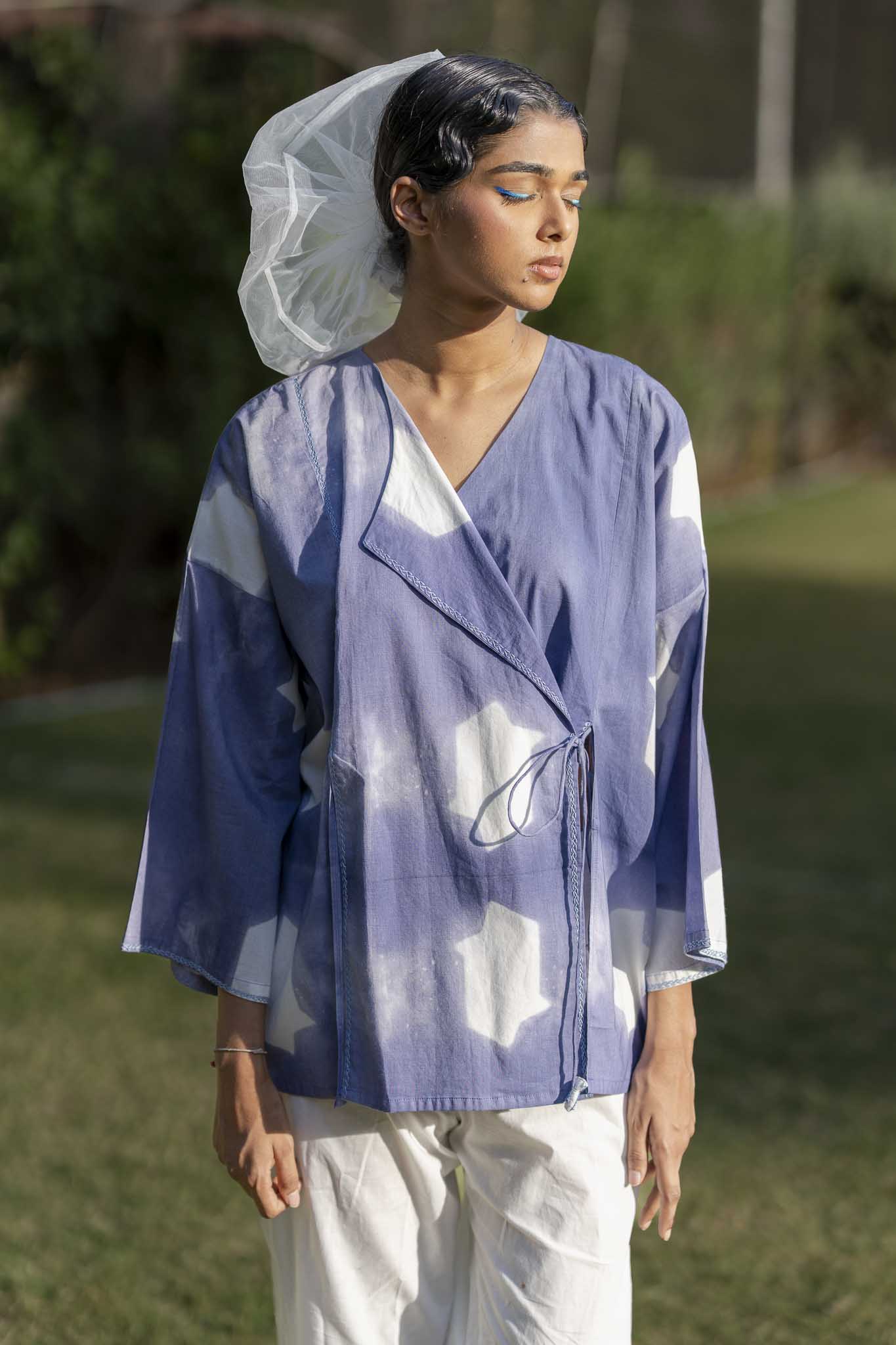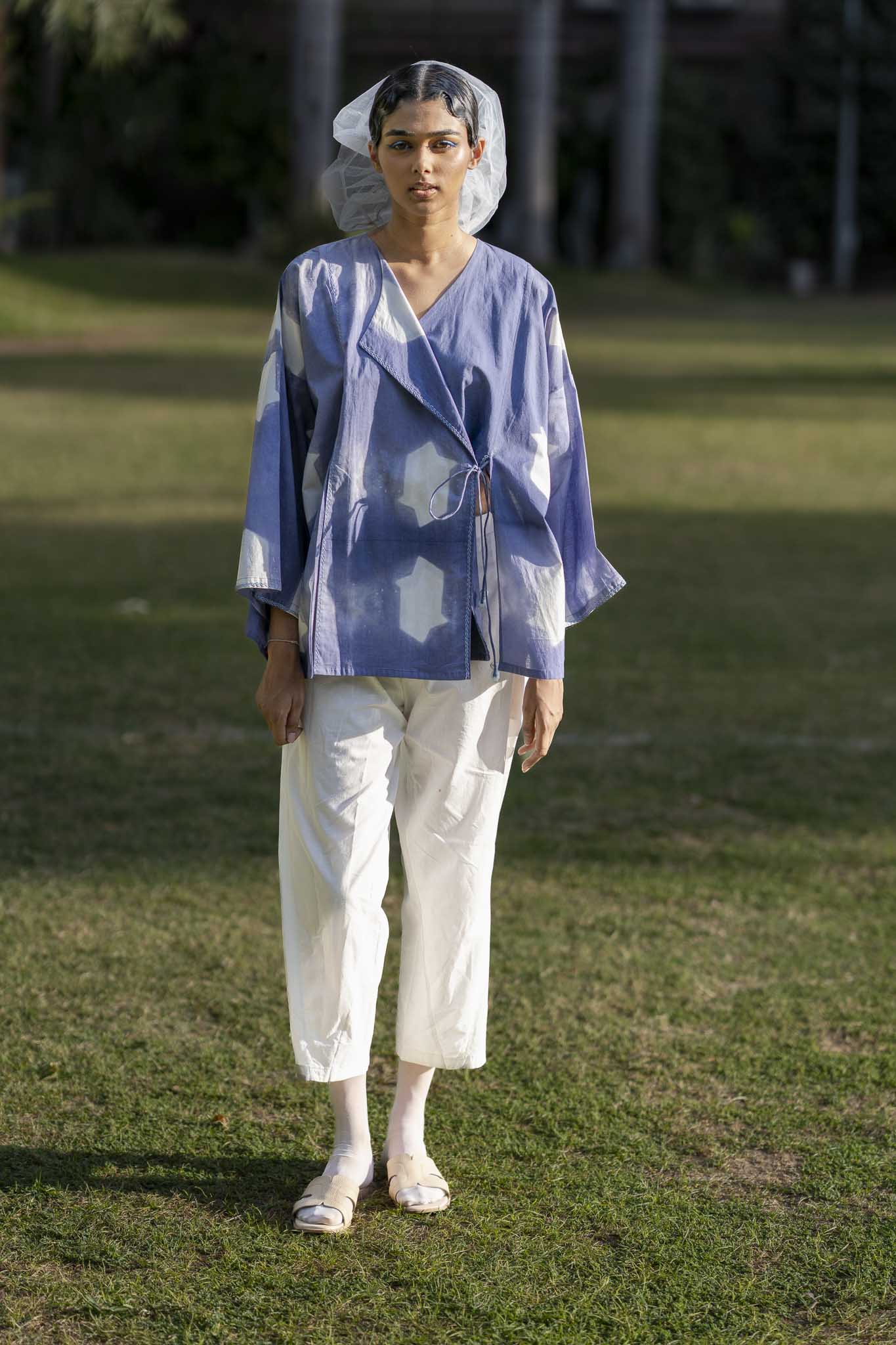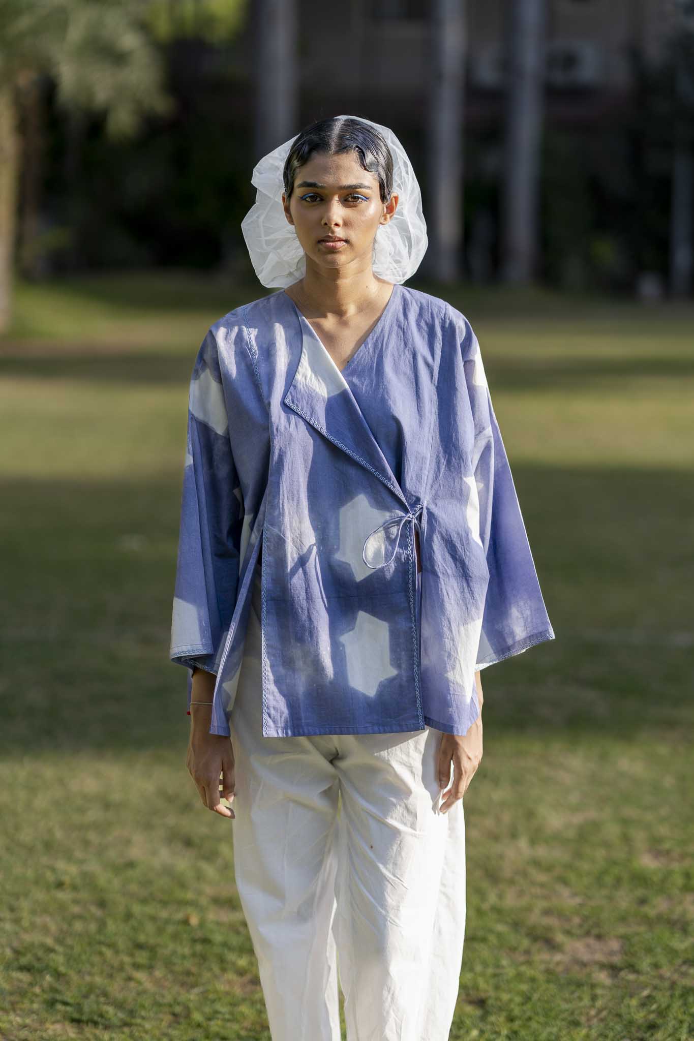 The jacket includes a flap collar for a sharp, structured neckline. The slits in the front panels add movement and ease. An inverted box pleat at the center back provides ease. Feather stitch is used to highlight the seams. Fish tassels are tucked to finish the cords.