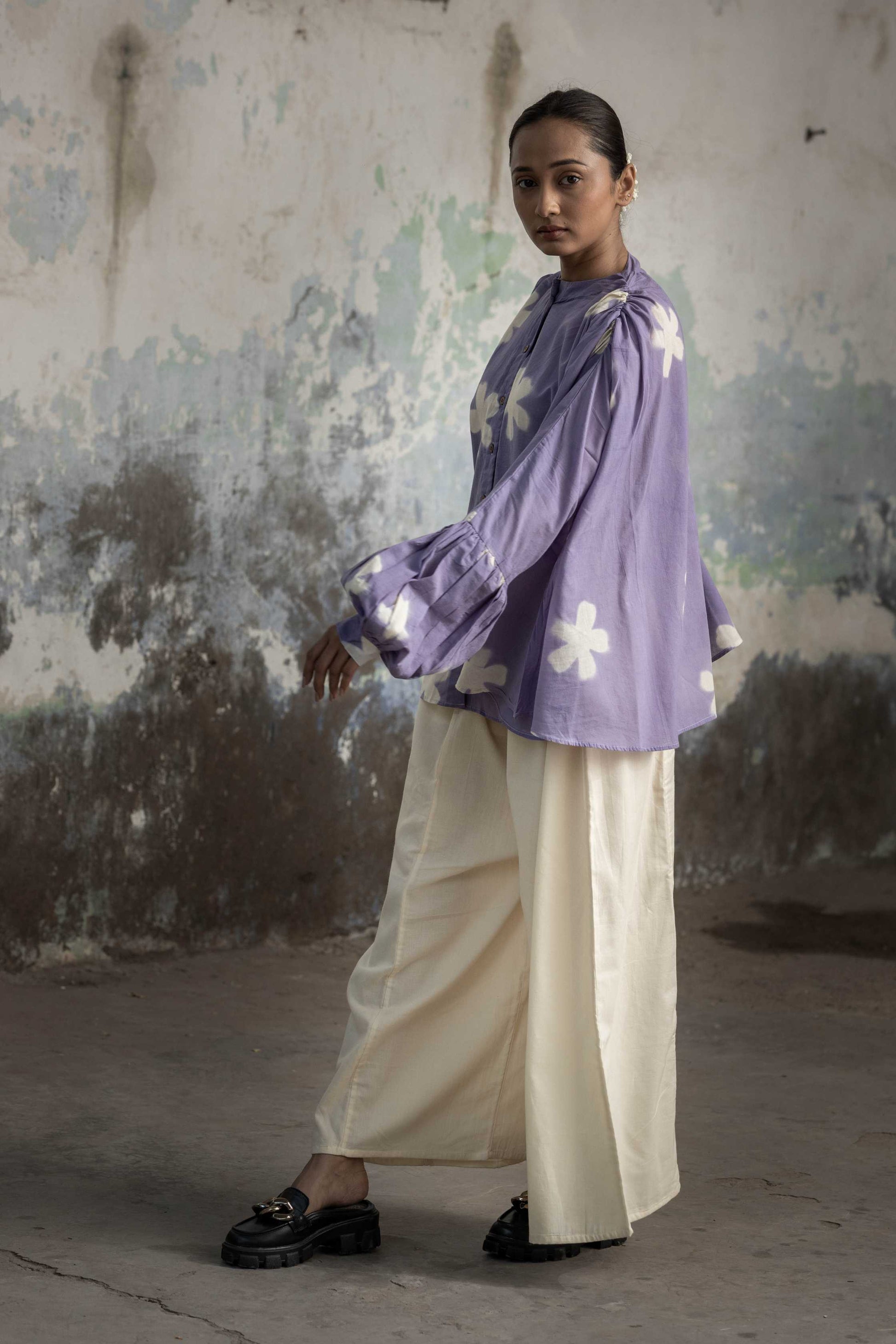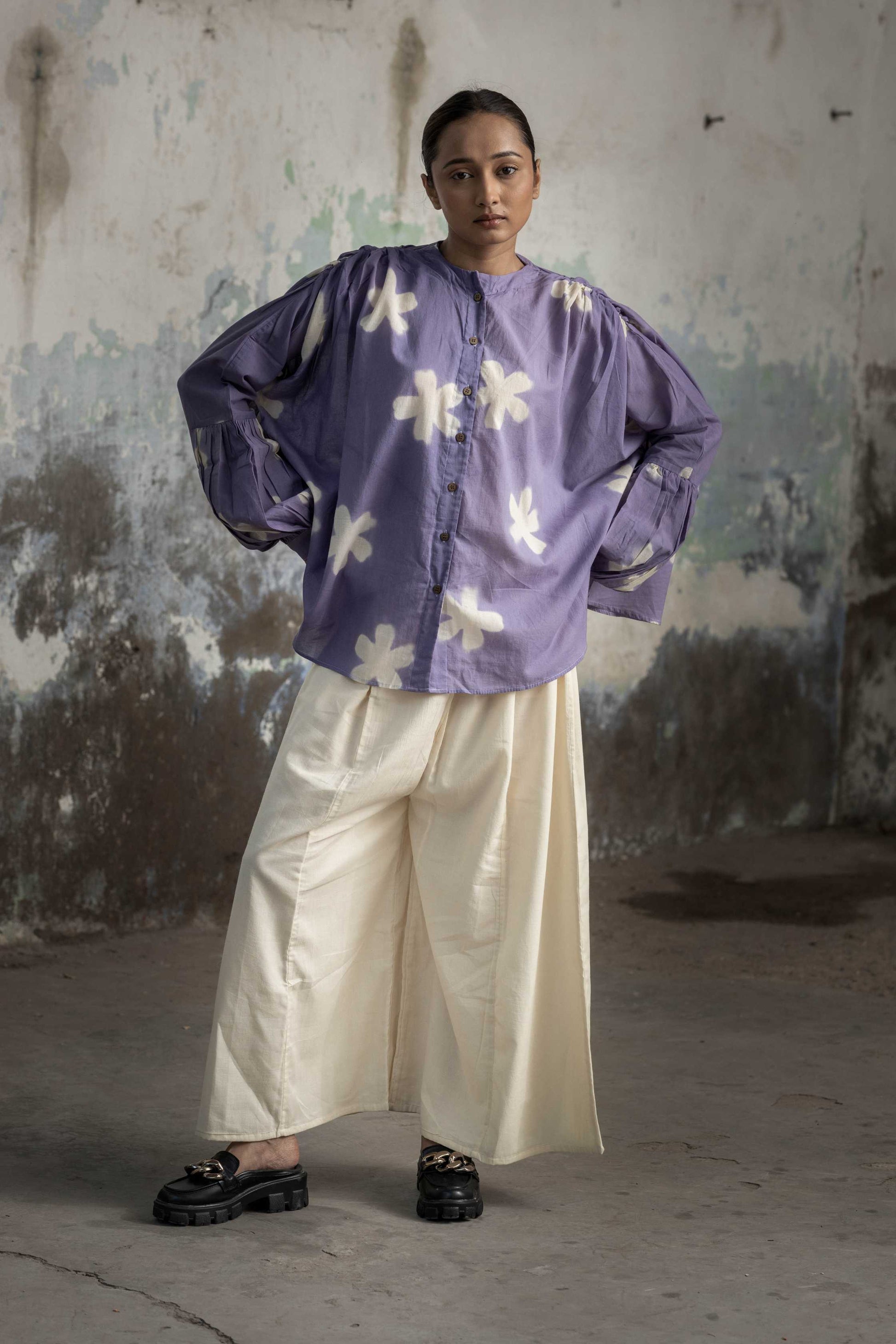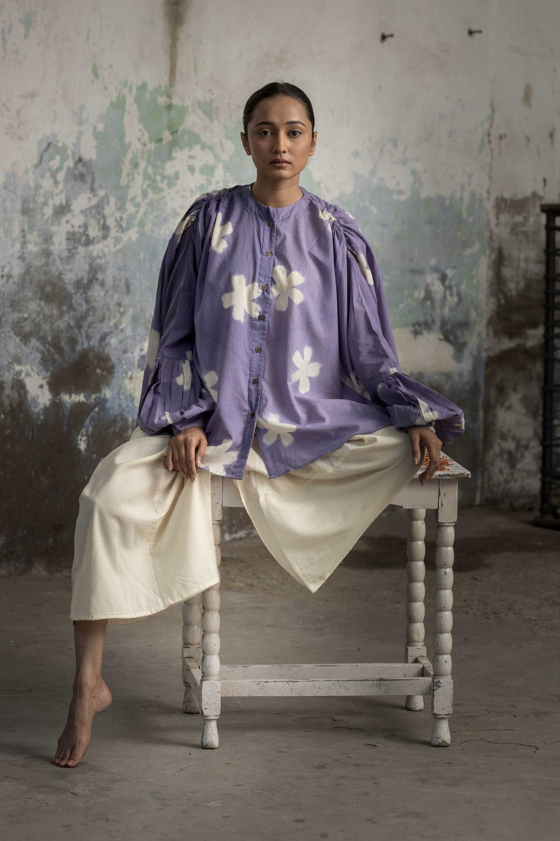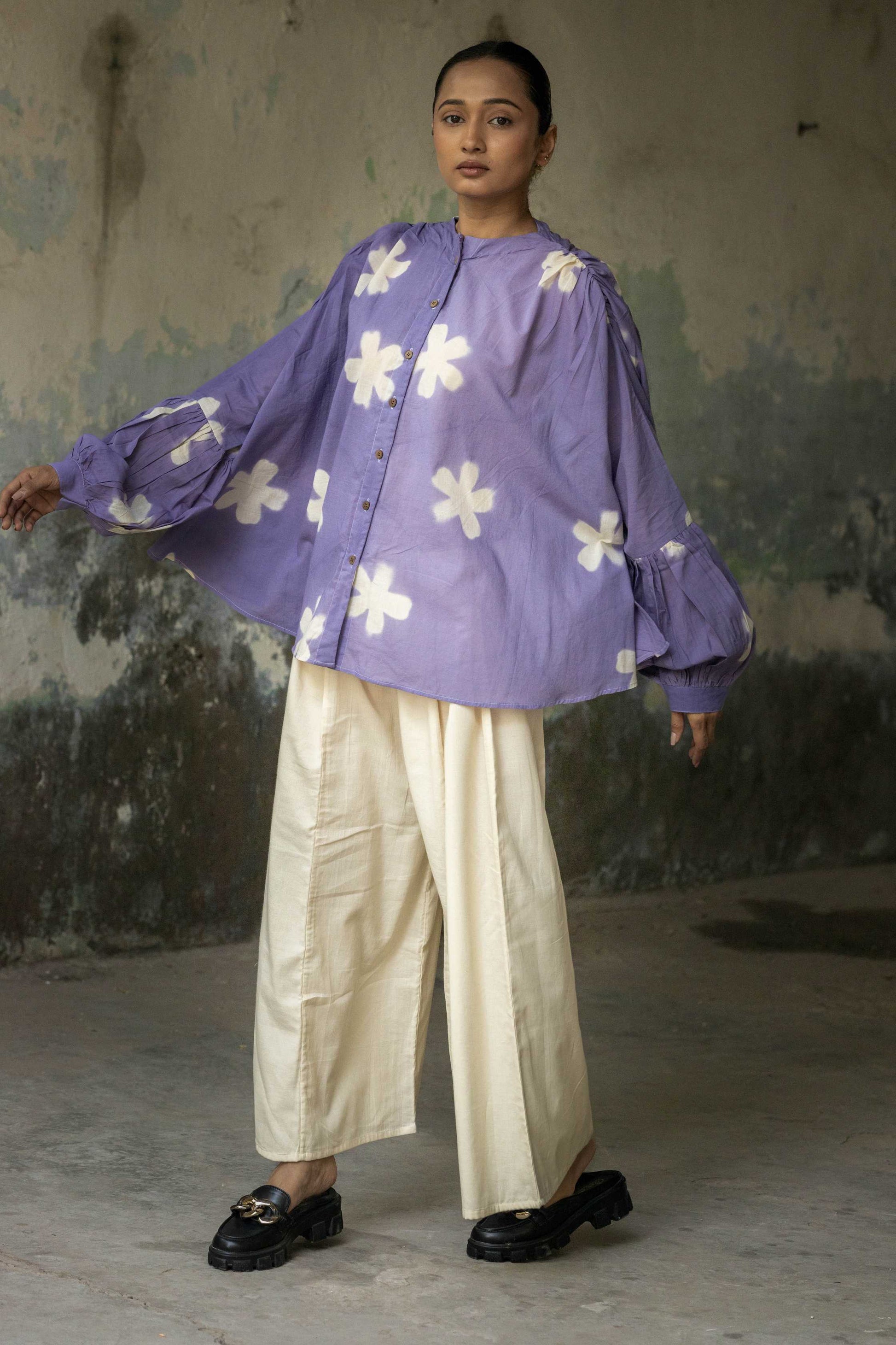 Our Orchid blush set features, Shibori dyed flare shirt with Bishop sleeve, clamp dyed in flower motif and white kali pants.