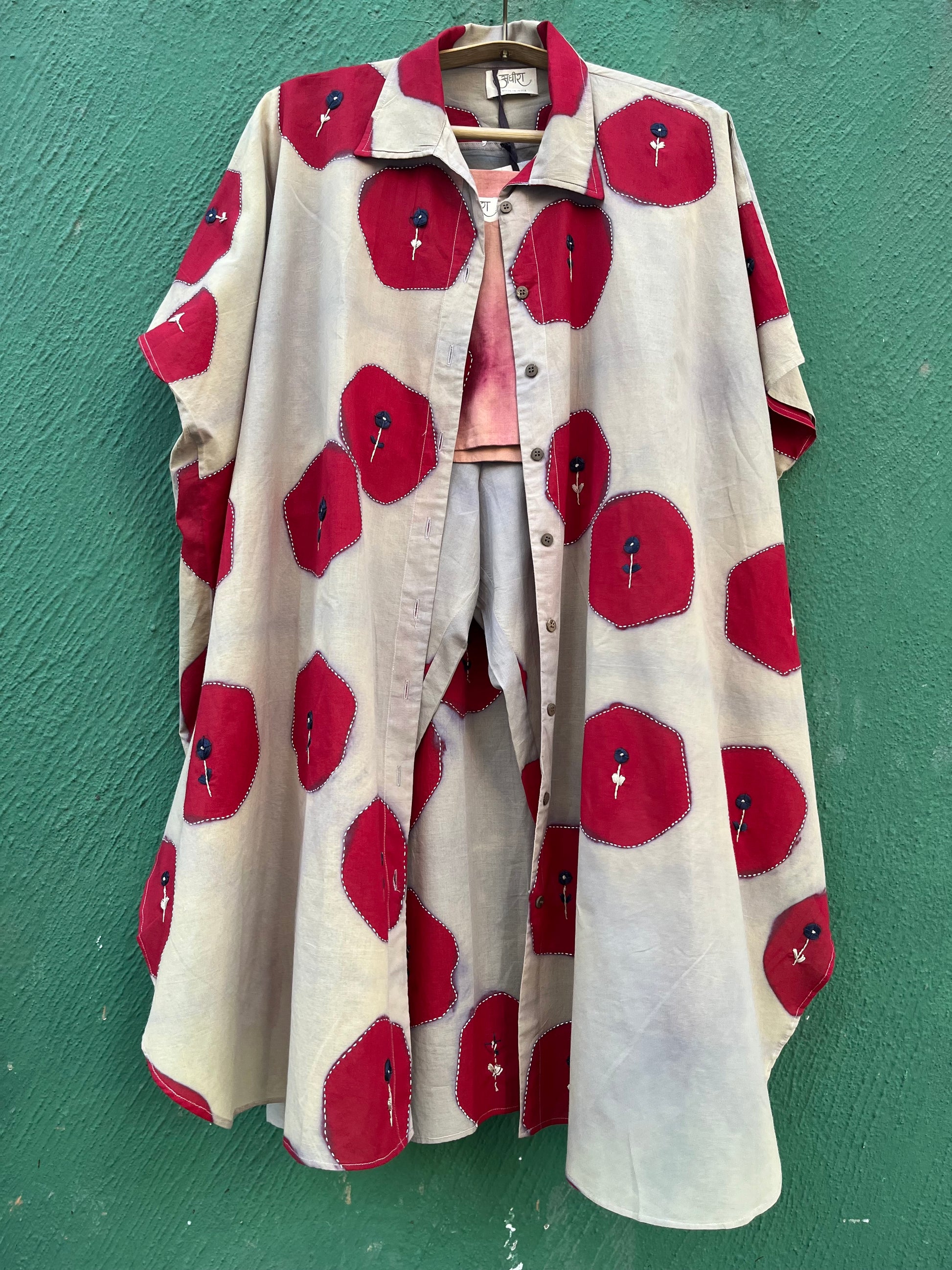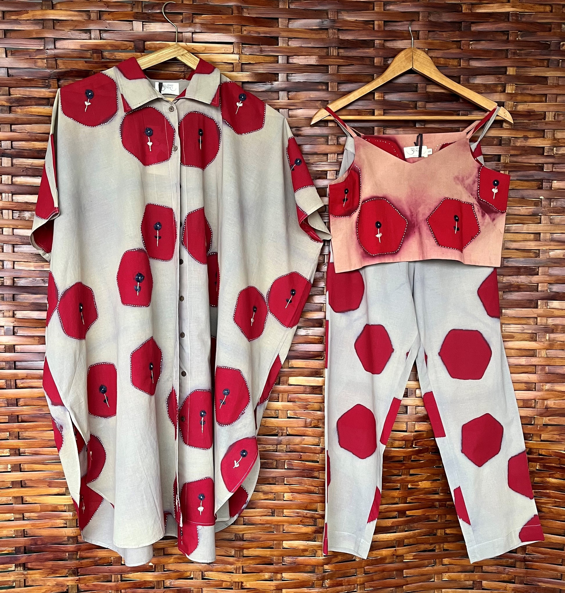 Hexagon hand dyed Hexa Bora set, Features Knee length jacket with direct sleeves, an inner as a crop top and stripped pants. One of our best feathery light and great for summers piece.