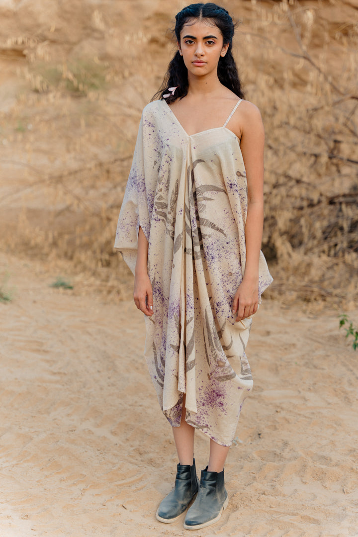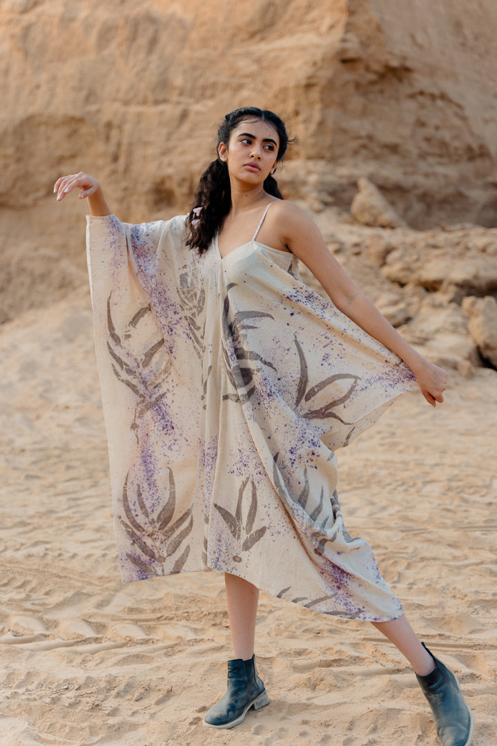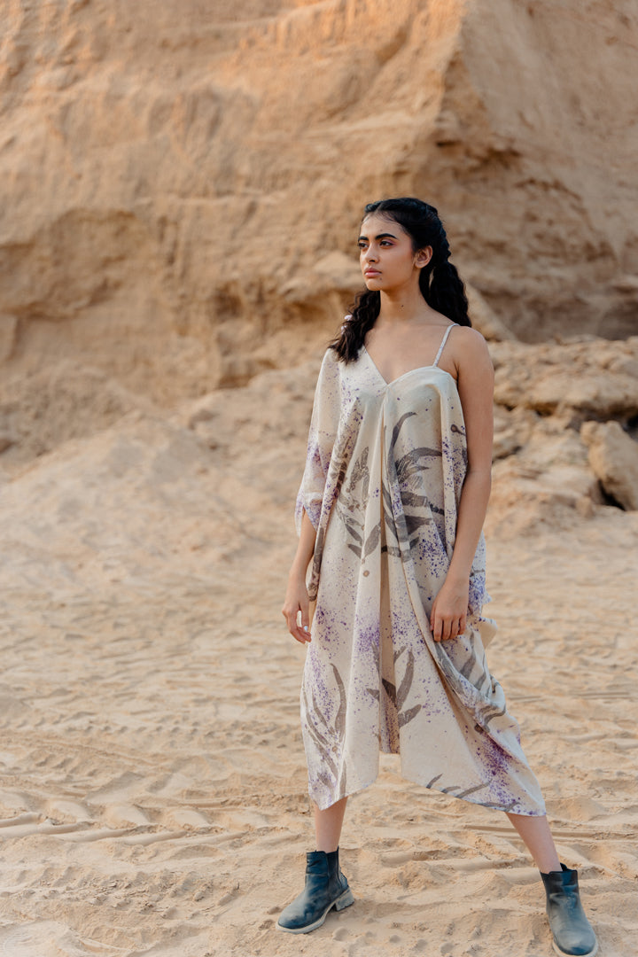 Asymmetrical hemline dress, features kaftan sleeve and spaghetti