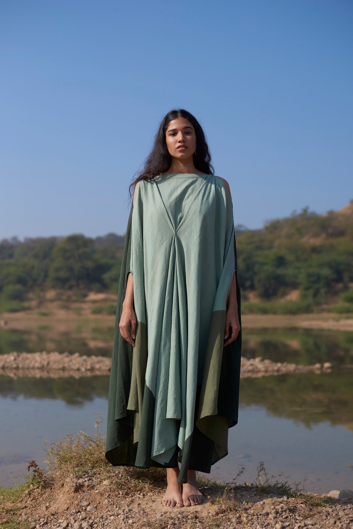 The peshawari dress has Cold shoulders, v neckline at the back, centre aligned front tuck and is colour blocked. Asymmetical hemline.