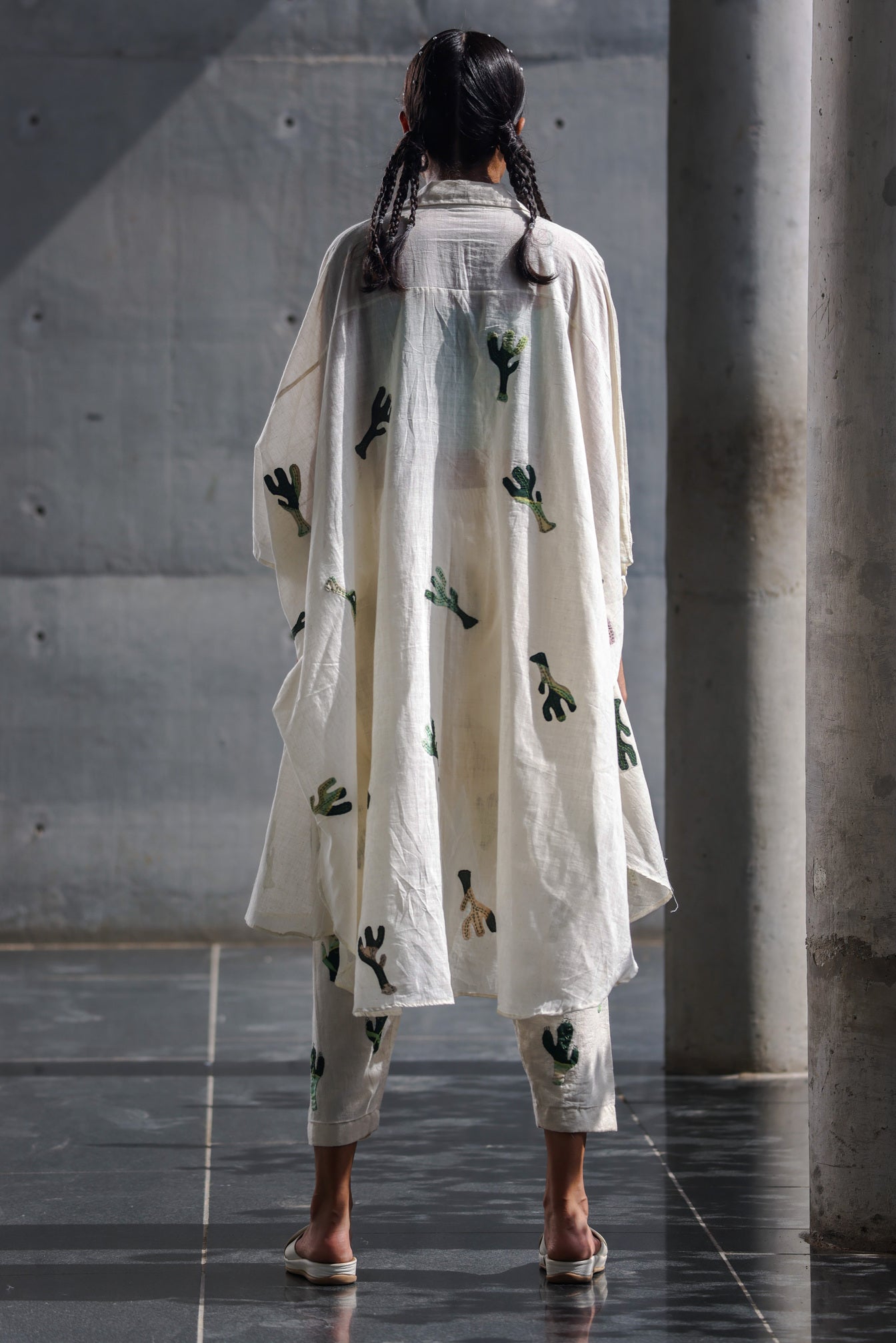 A three-piece set pairing the Prickly Breeze Overlay, Bustier and Pants, all with flower applique details. The free size overlay features a shirt collar, a patch pocket and side slits. The bustier style crop top features noodle straps and a V-neck. The cropped balloon pants feature side pockets and an elasticated back.