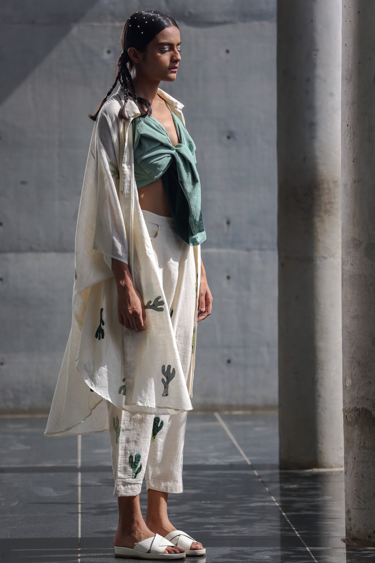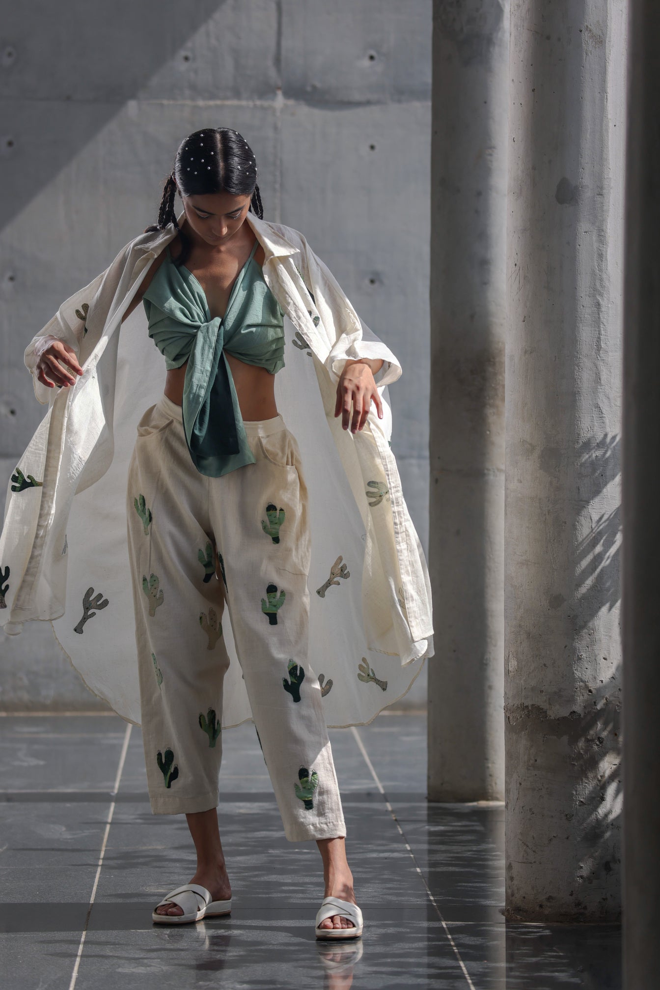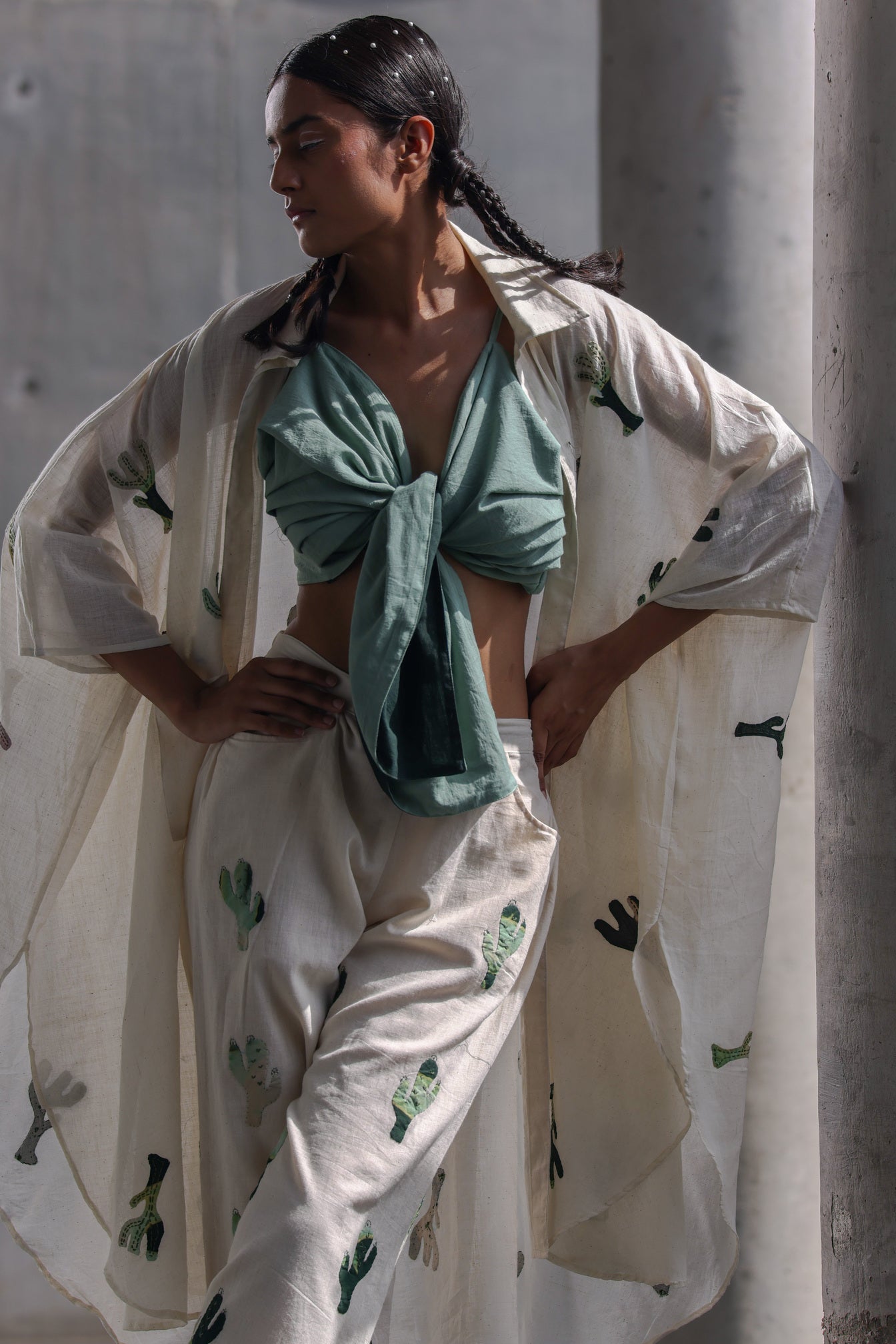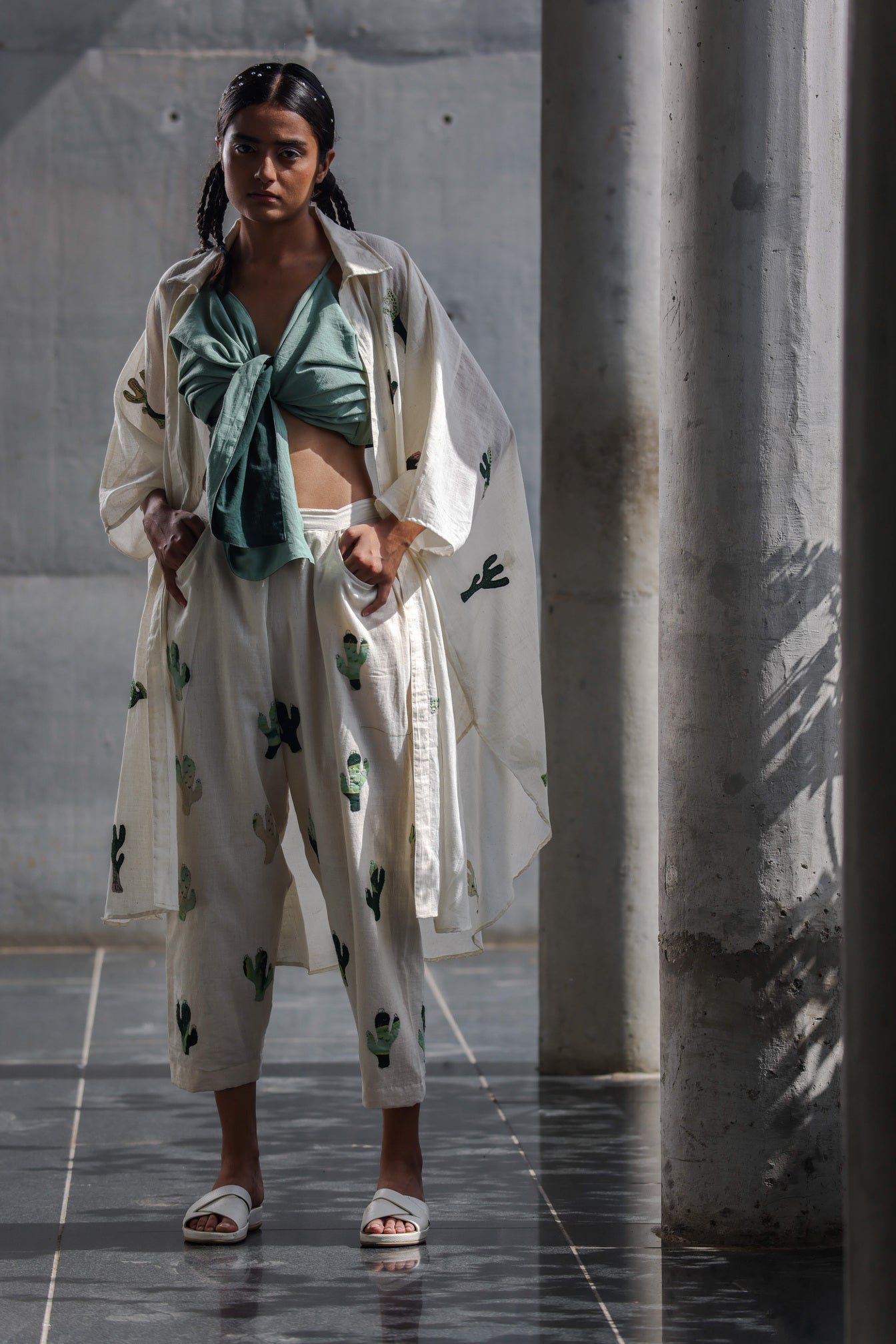 A relaxed open front overlay with cactus applique details. Features a shirt collar, a patch pocket and side slits.