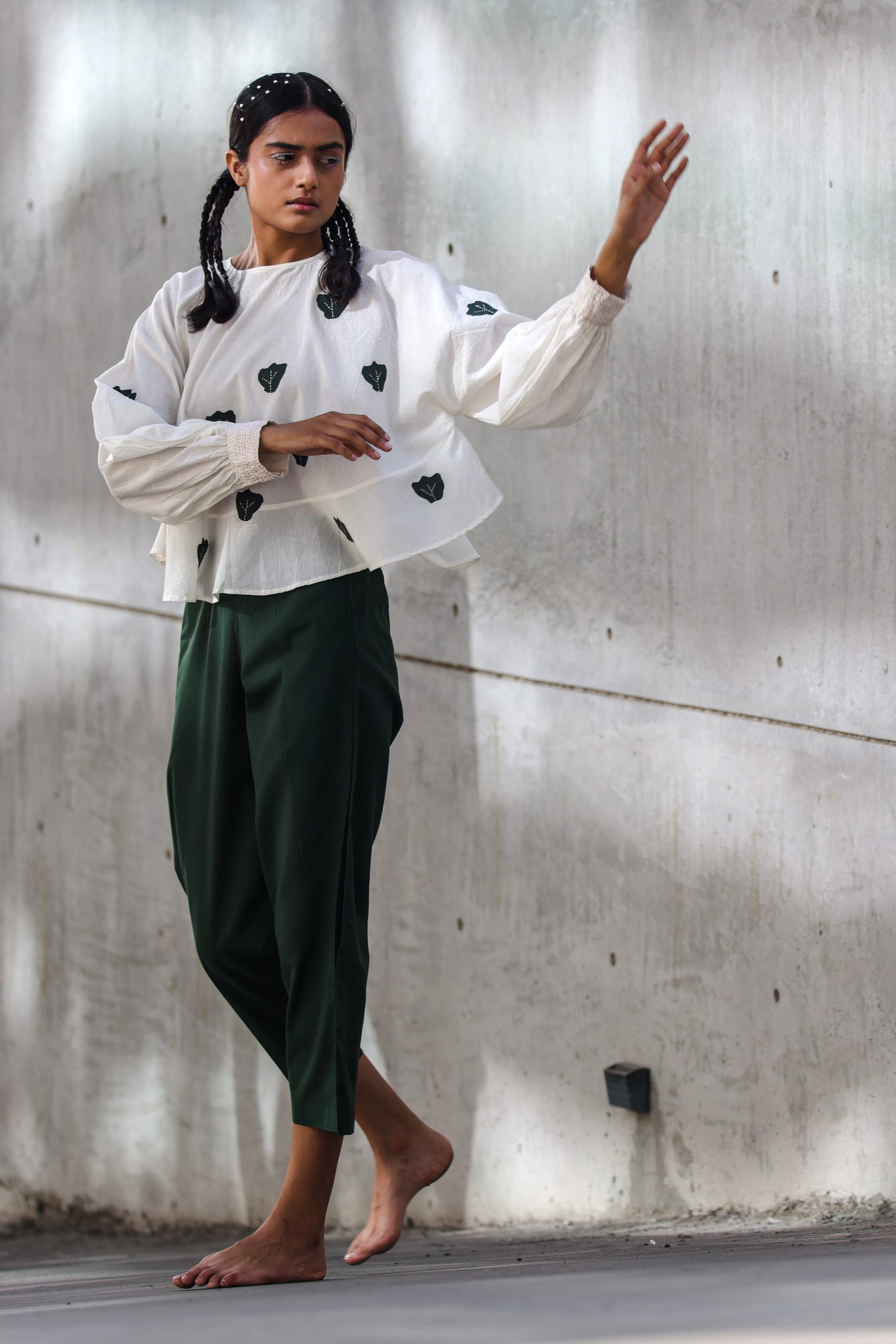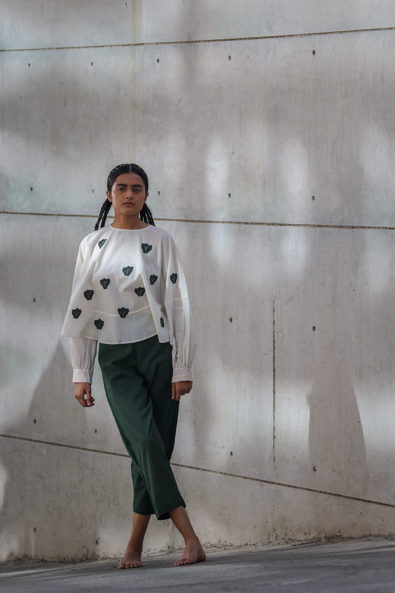 A two-piece set pairing Sappy Flora Top and Pants. The oversized tent top features flower applique details, gathered sleeves, Kantha embroidered cuffs, a round neck and a keyhole back button. The solid cropped straight leg pants feature side pockets and an elasticated back.