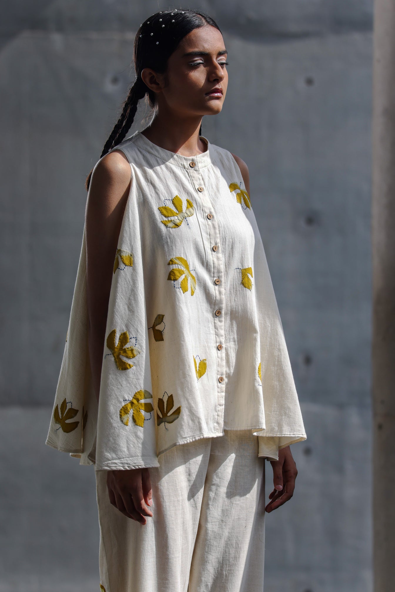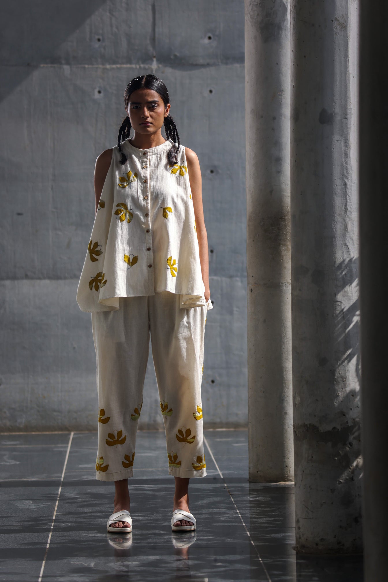 A swingy A-line tent top with flower applique details. Features a round neck and front button placket. paired with Ankle length pants with side pockets and all over applique work