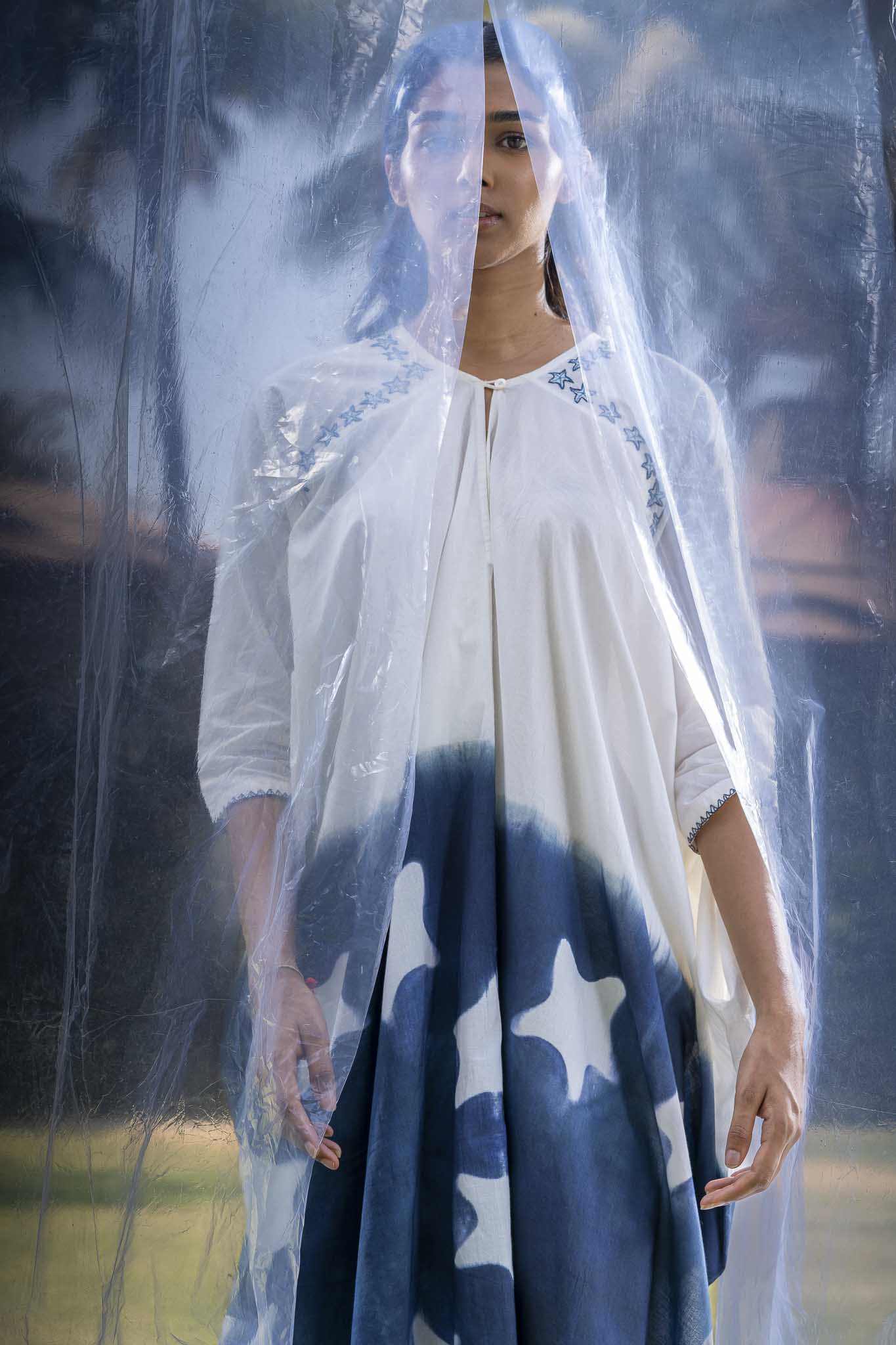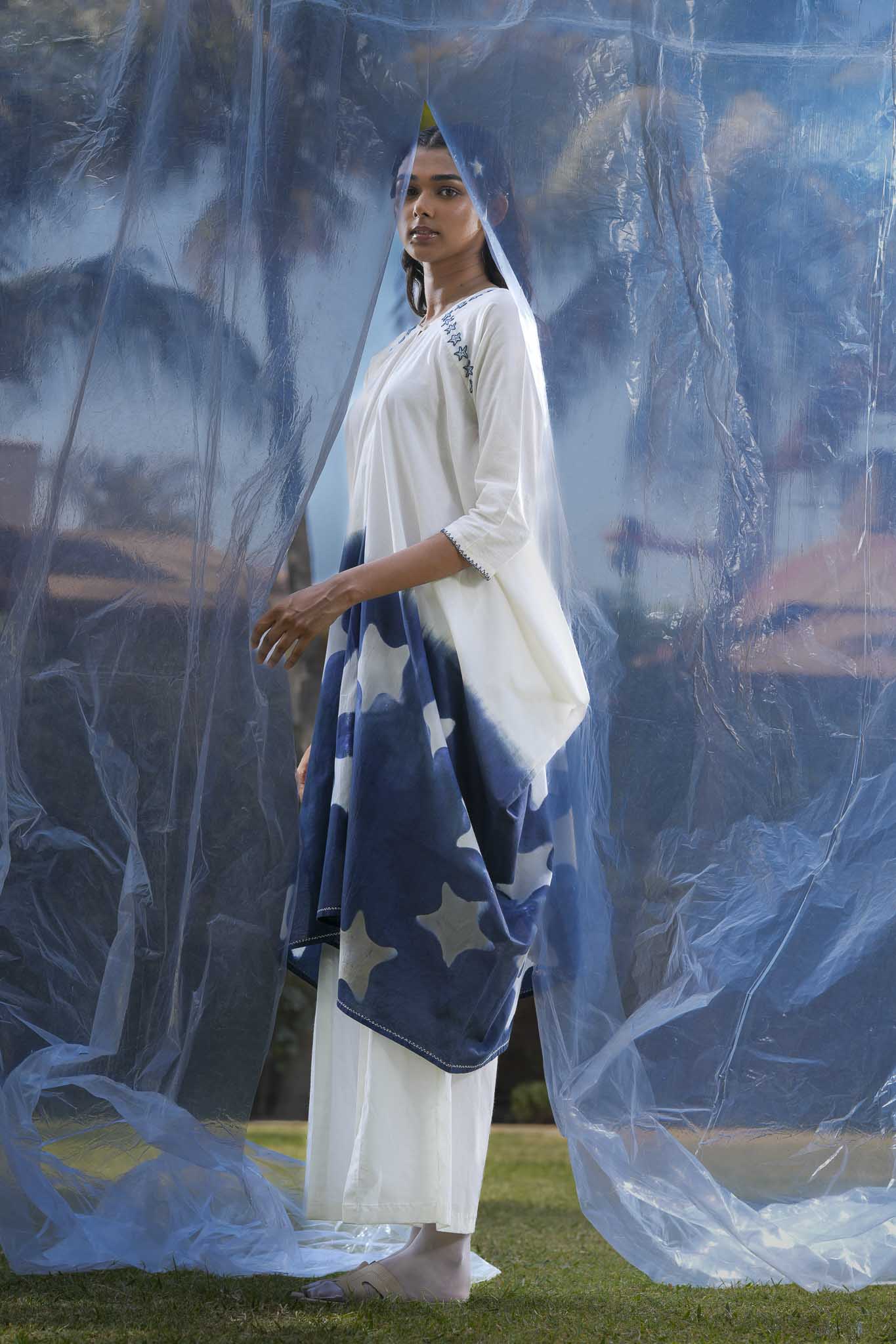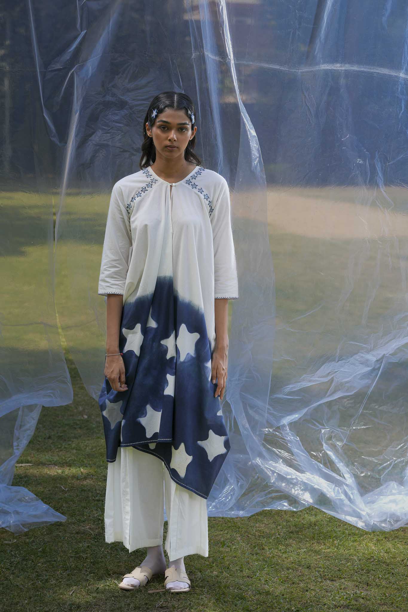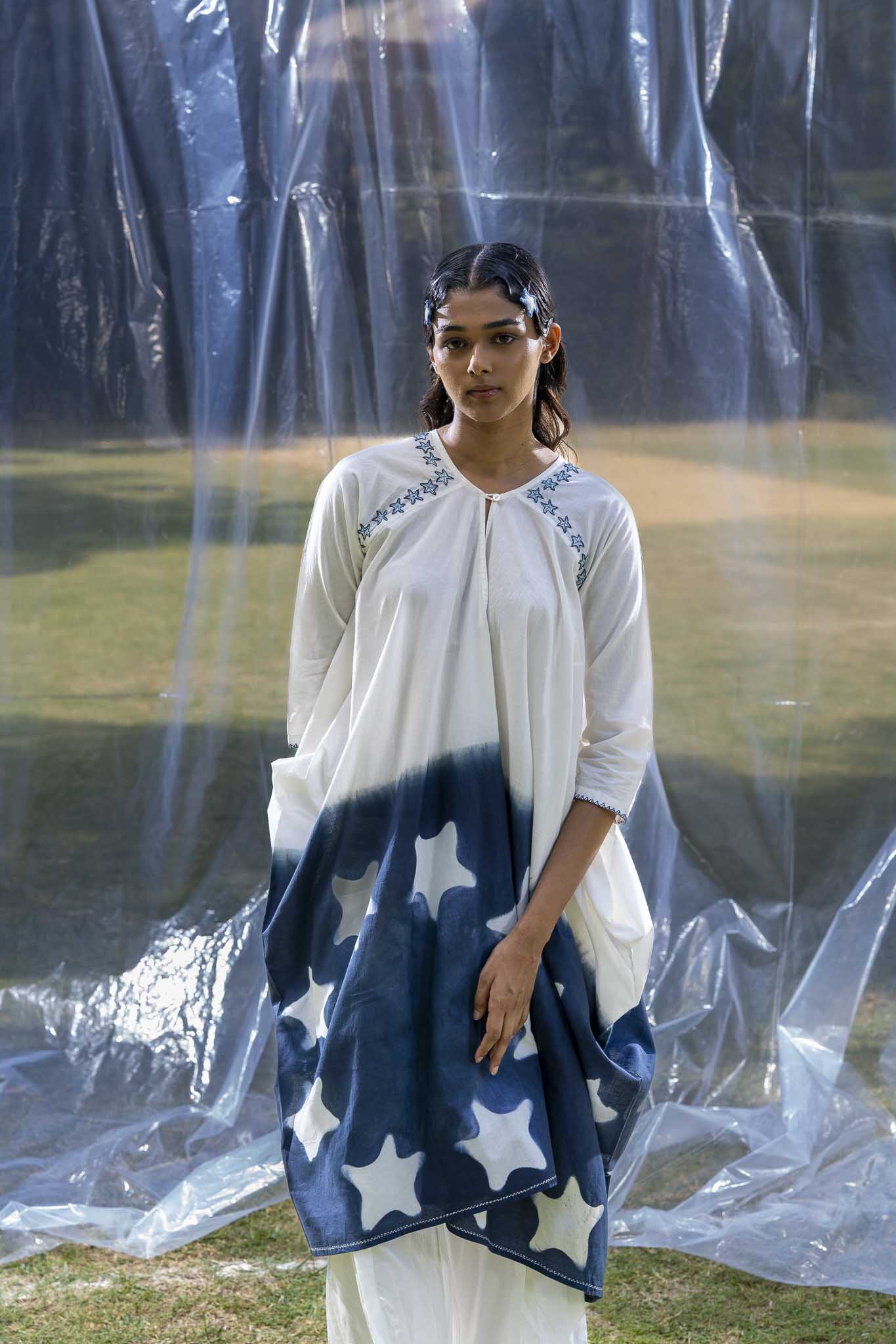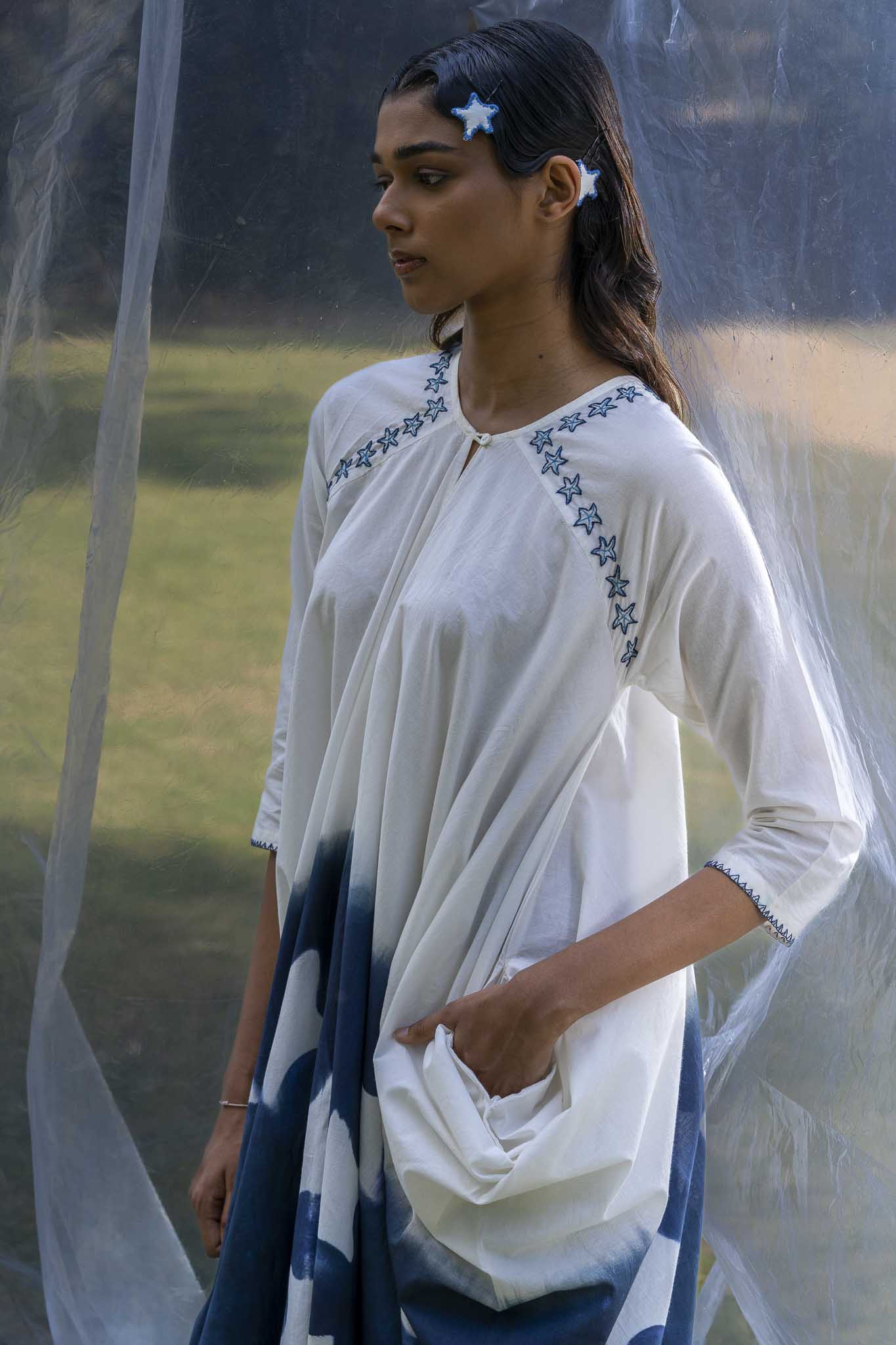 A clean U-shaped neckline defines the front, paired with raglan sleeves that offer ease of movement and a smooth shoulder line. Concealed pockets are integrated into the side seams for practicality. The dress falls in an asymmetrical manner, creating a relaxed and balanced structure. Starfish are embroidered along the neckline using stem and back stitch.