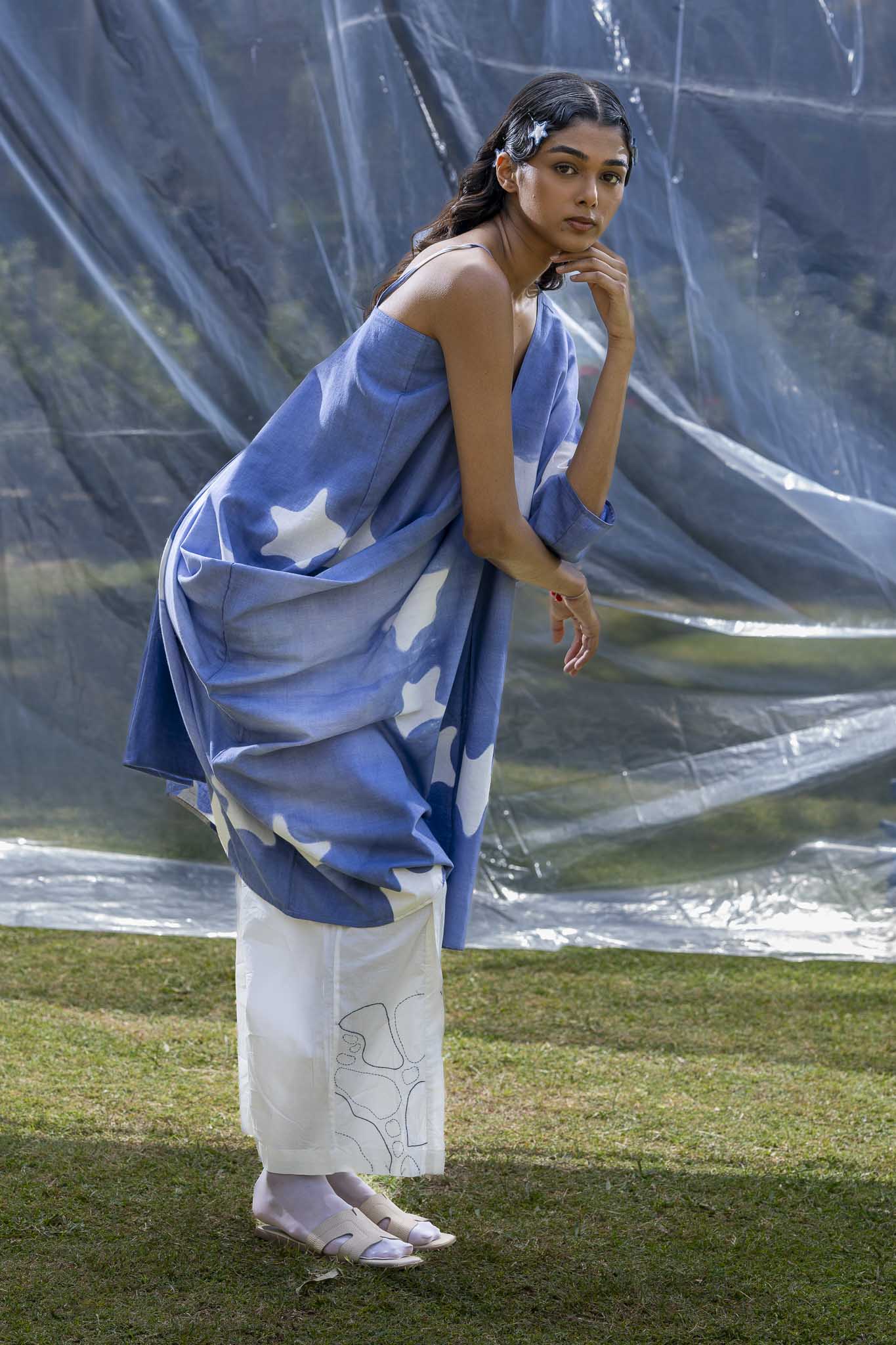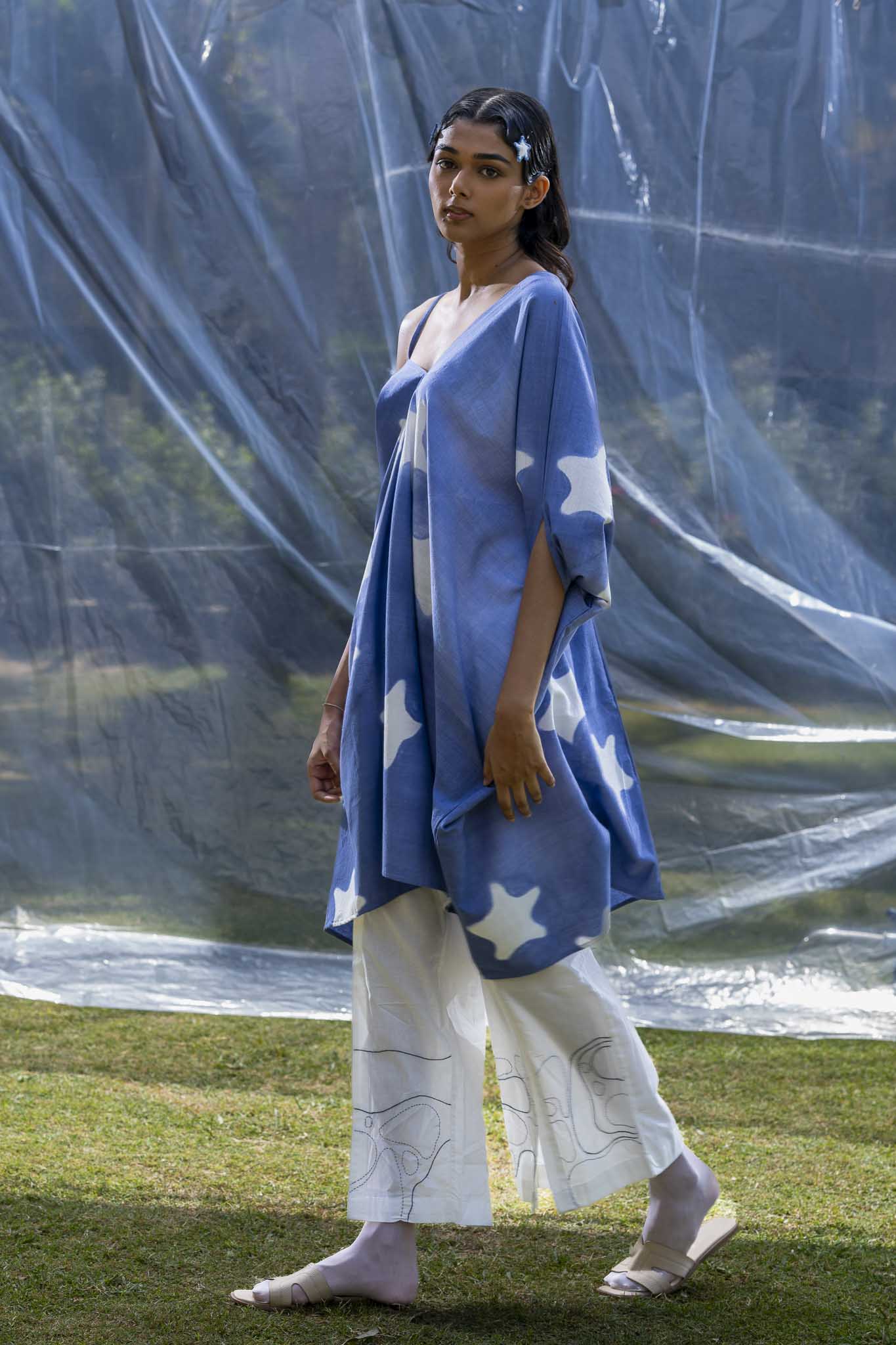 This is a kaftan-style dress, designed with a flattering V-neck. It has a star clamp-dyed pattern and asymmetrical hemline and sleeves.