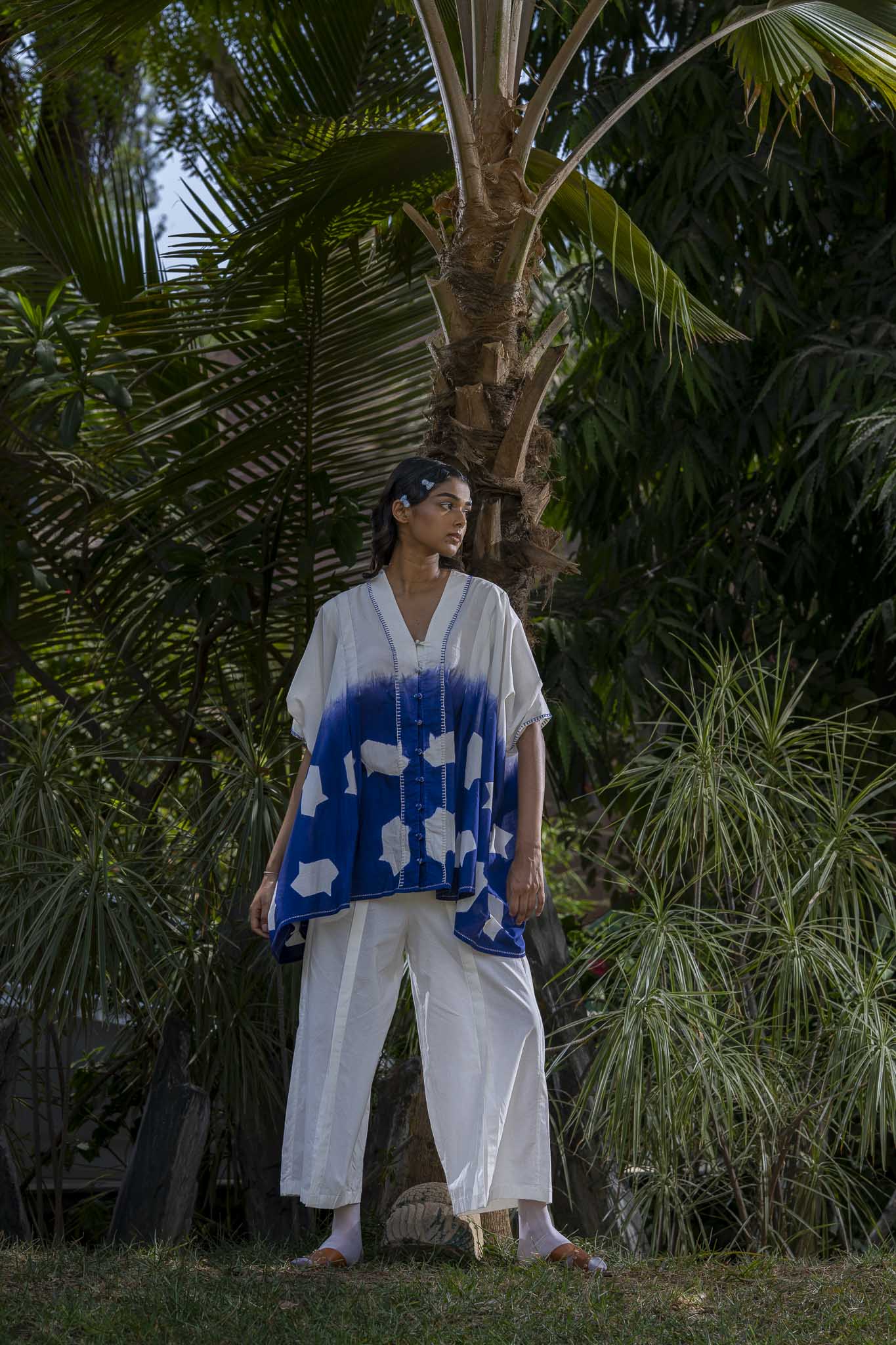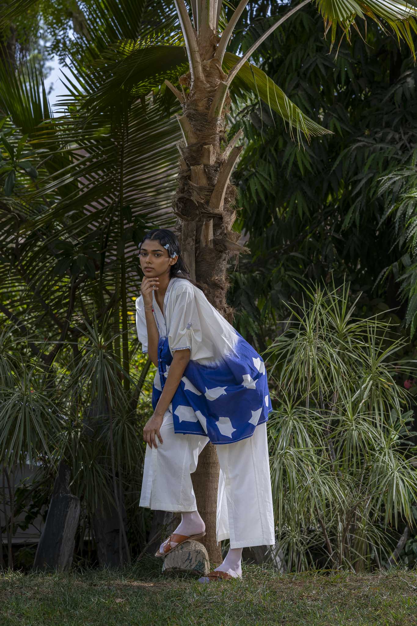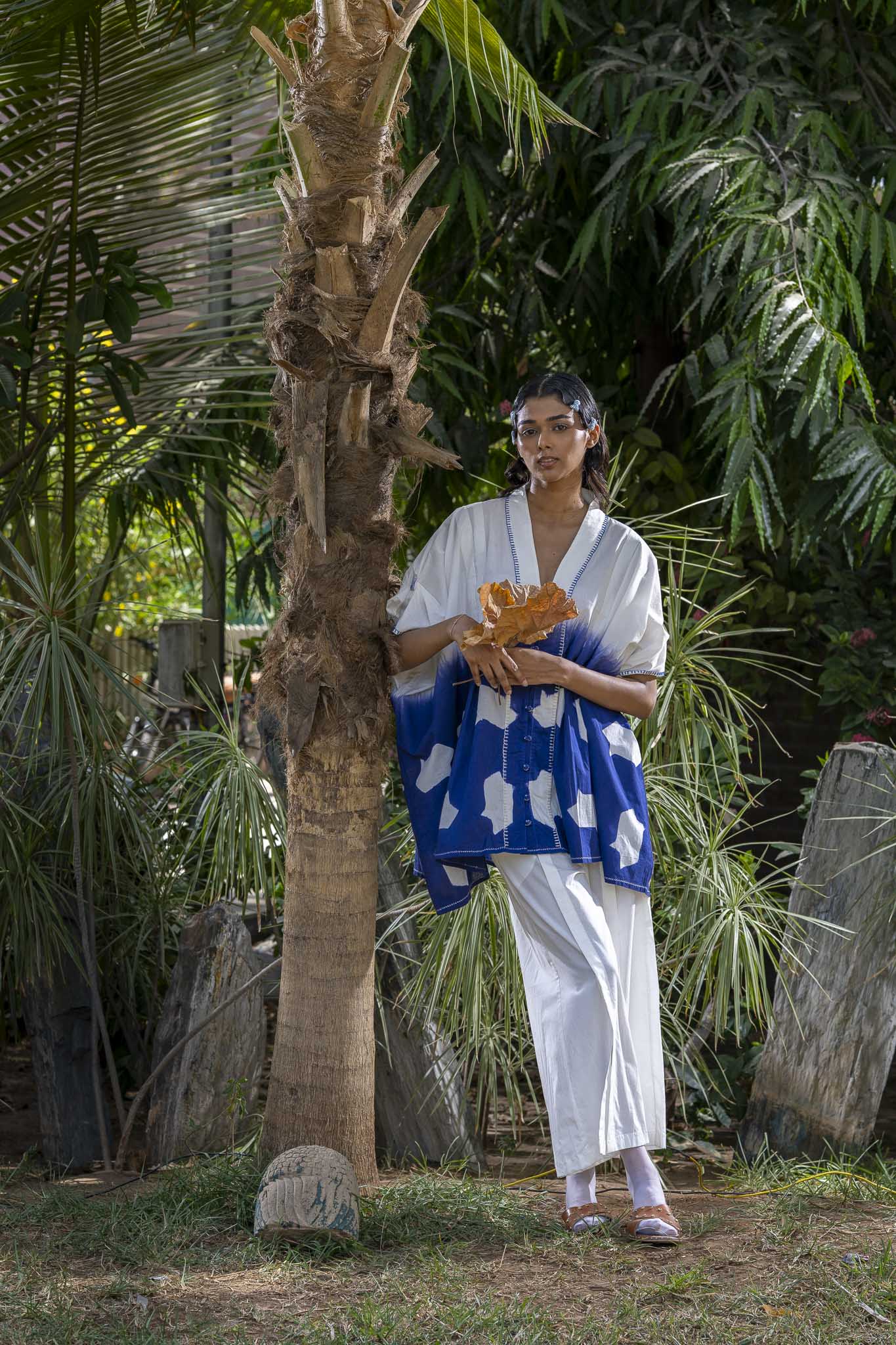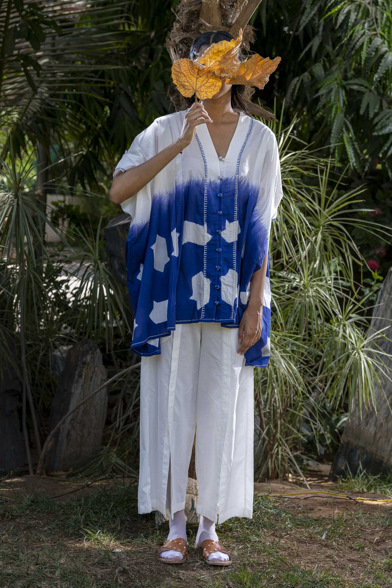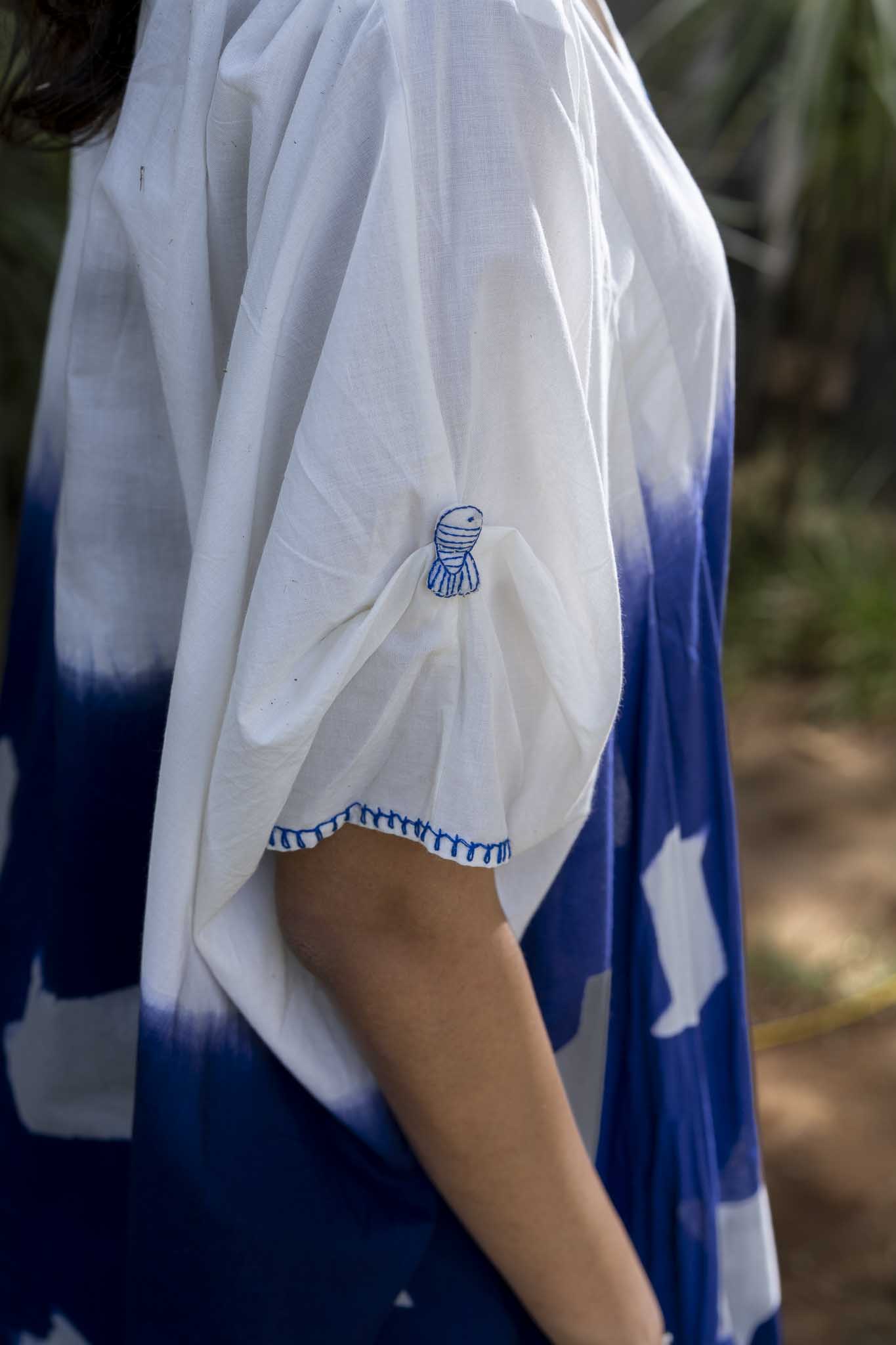 This kaftan is a blend of dyeing and refined detailing. The piece is partially clamp-dyed. Fish tassels are neatly tucked at the sleeve pleat detail. The placket has fabric knot buttons, which are highlighted with running stitch and cross stitch. The seams at hem is highlighted with running stitch.