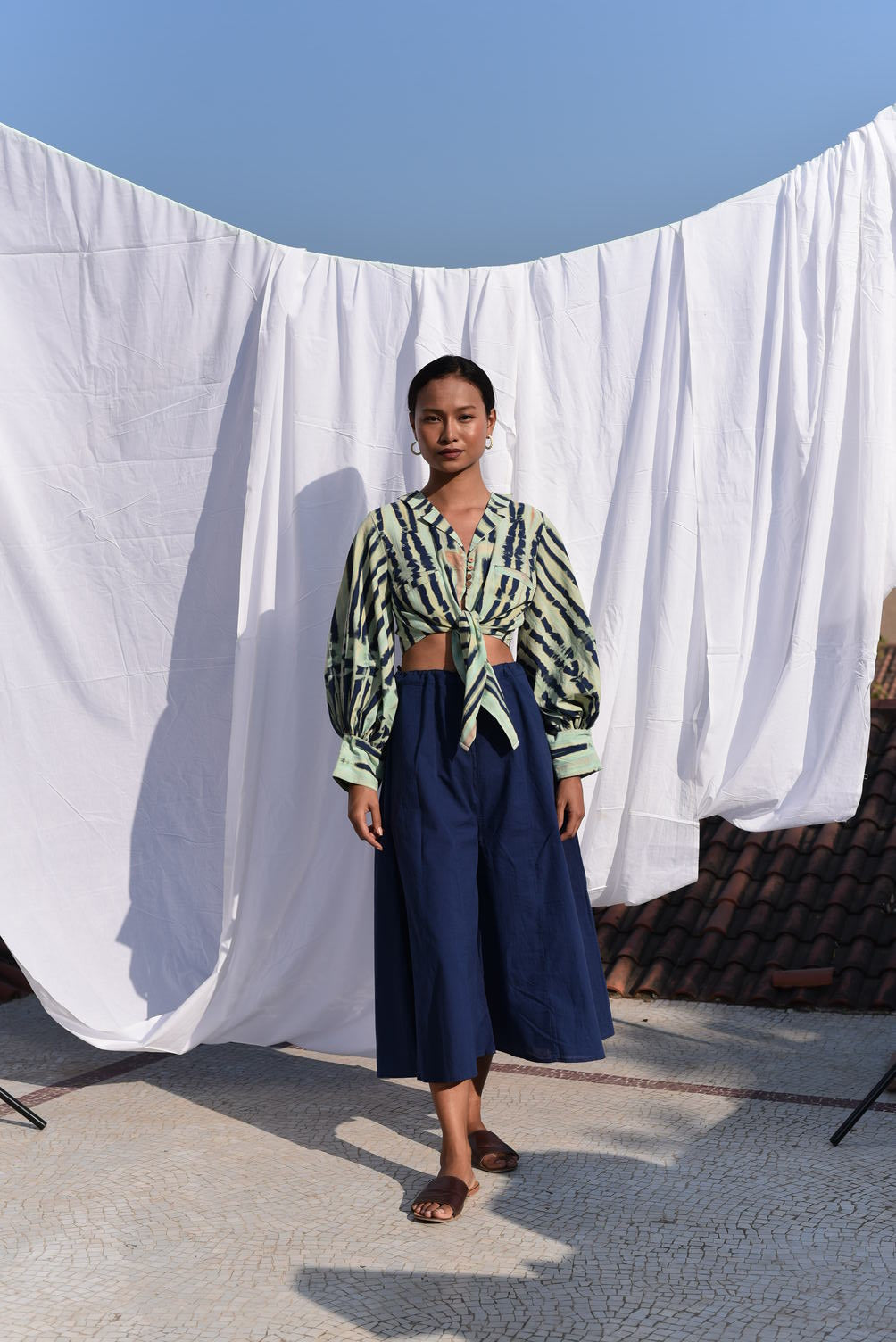 A two-piece set, Viyan Knot shirt Features collar, Shibori on all over the top paired with